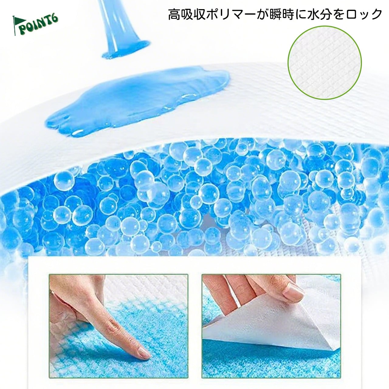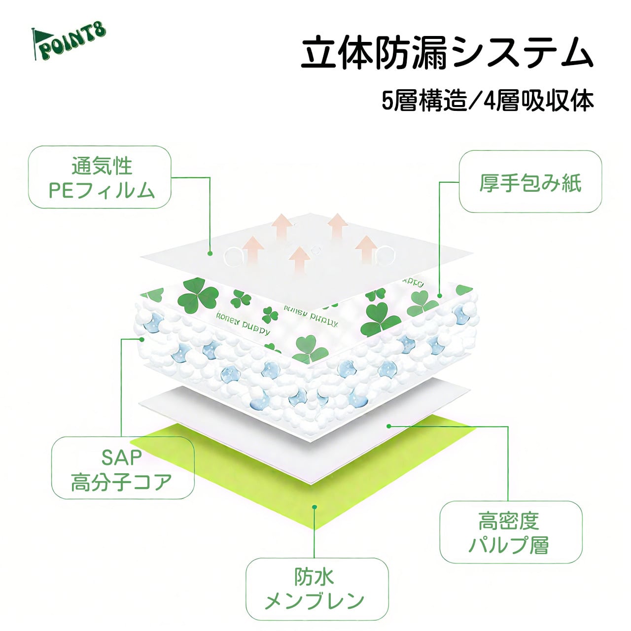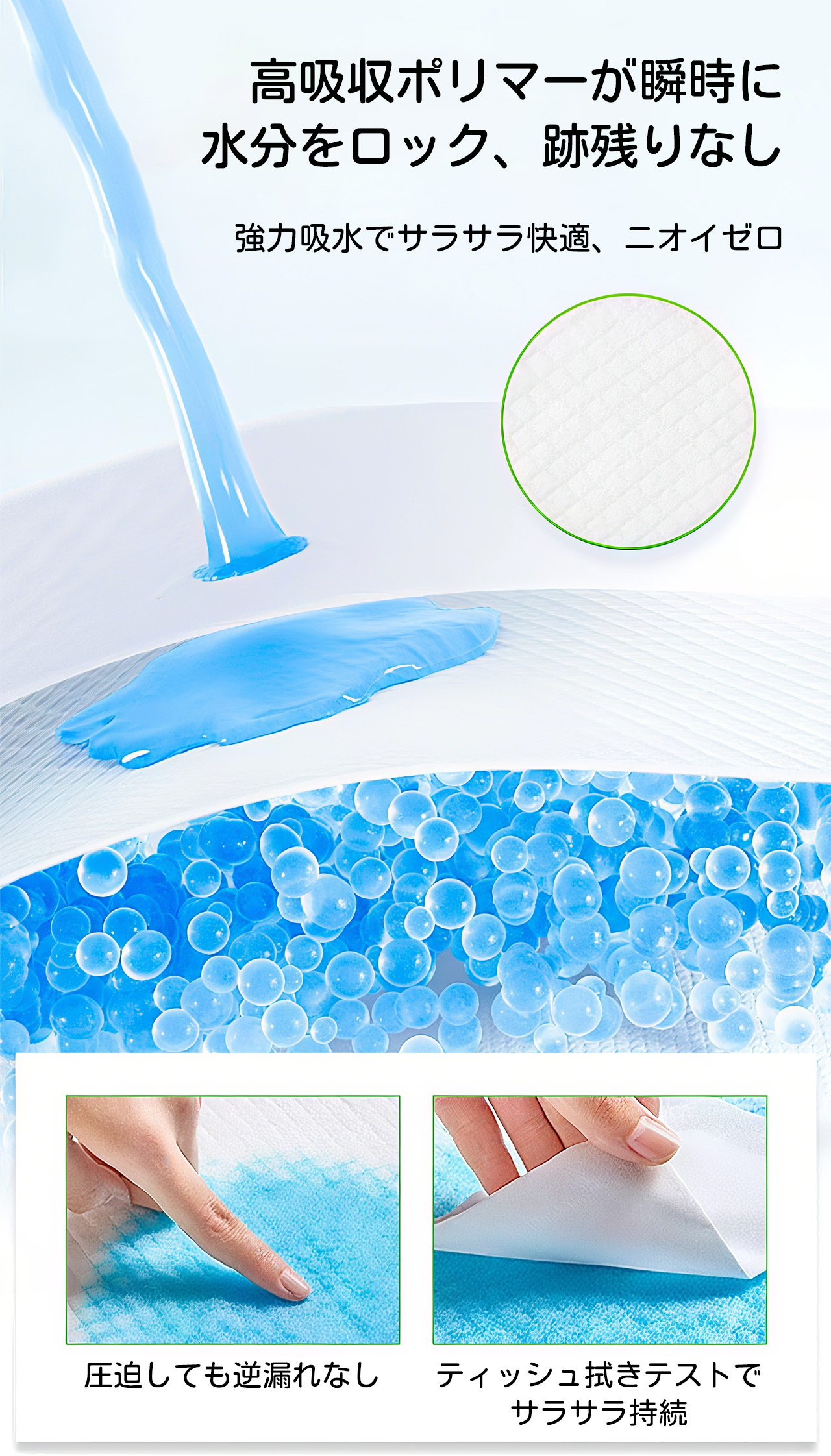 ✅ 5層吸水構造:不織布+パルプ+SAP+吸収層+PEフィルムの多層構造。約3秒で瞬間吸収、吸収量は最大1500ml/㎡!