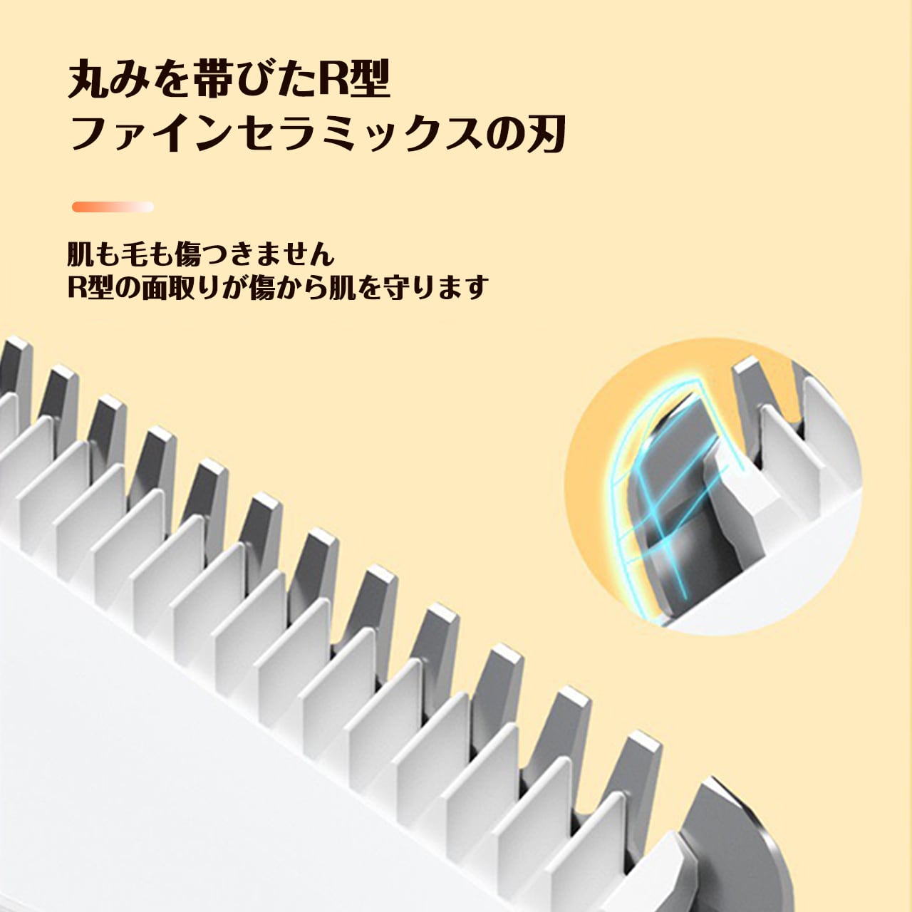 → 精鋼+セラミック刃にR角処理。滑らかで毛が引っかからず、敏感な部位も安全にカット可能。