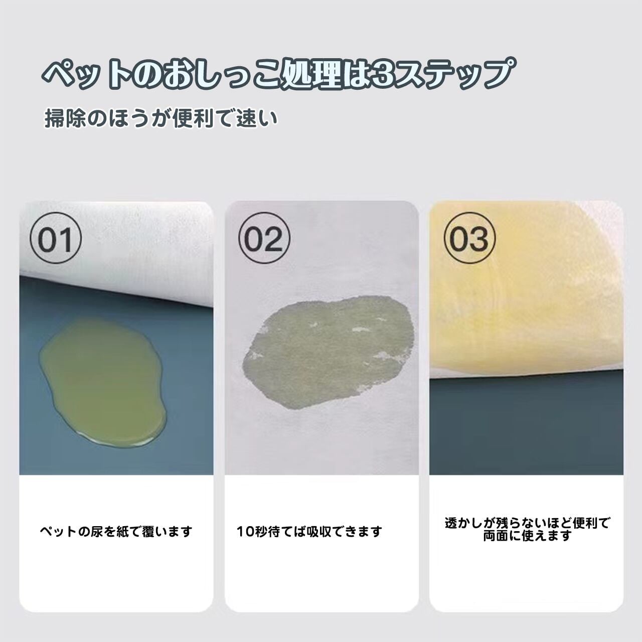 ■ 使用説明:吸尿紙を液体に直接かぶせます。こすらずにじっと待っていると、液体がすべて吸収されます。