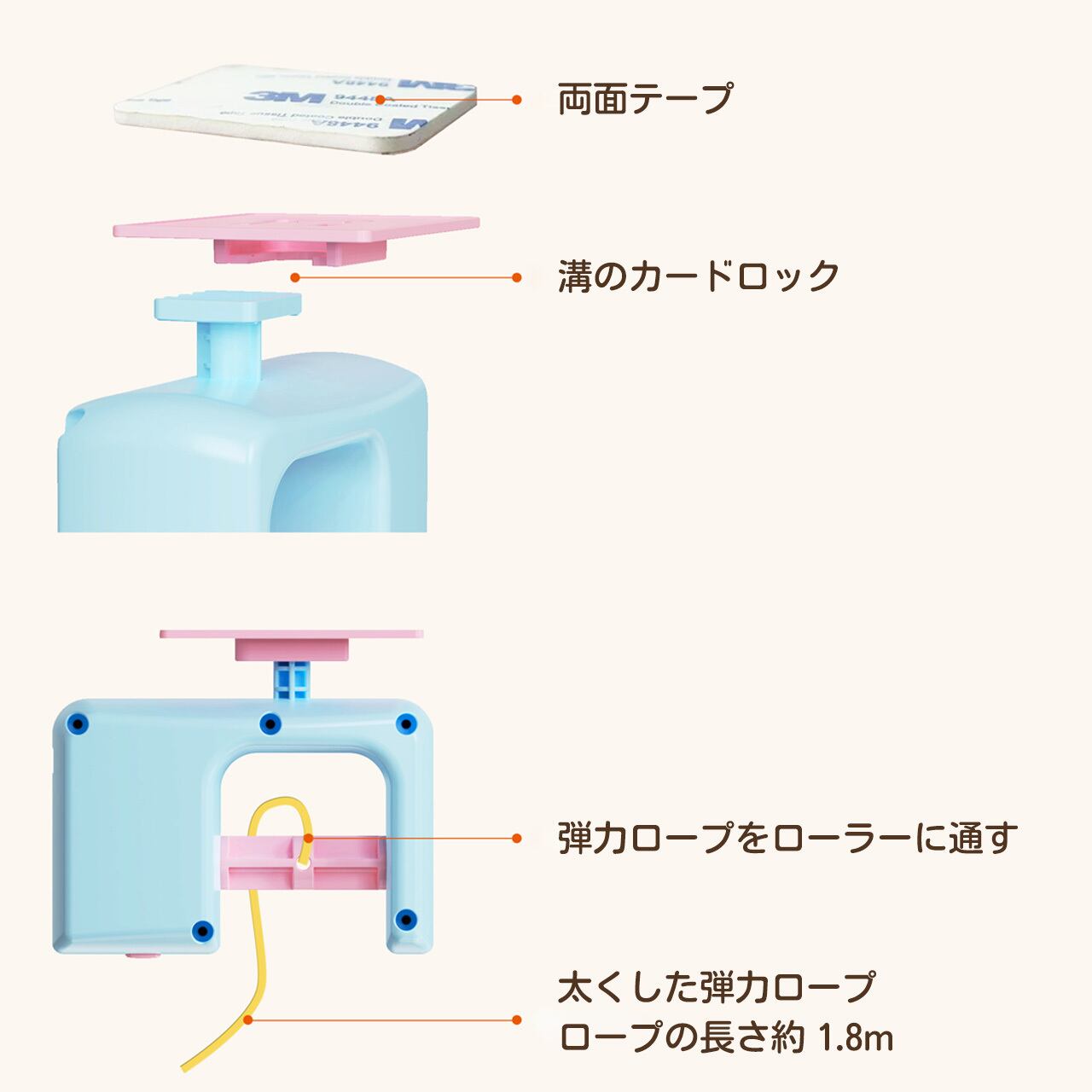 「ローラー中央の穴にゴムロープを通す」