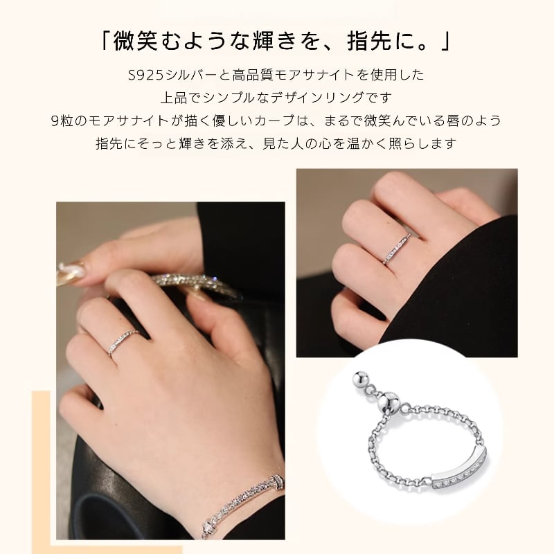 9粒のモアサナイトが描く優しいカーブは、まるで微笑んでいる唇のよう。