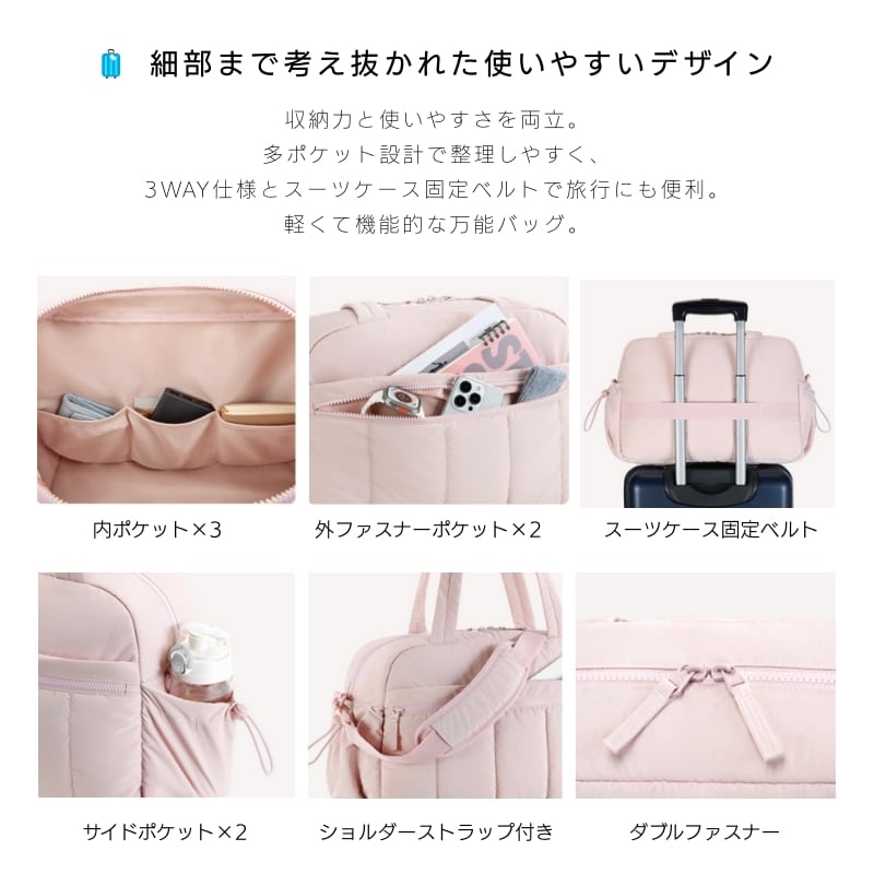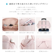 手提げ・肩掛け・斜め掛け対応。さらにキャリーケース固定ベルト付きで旅行にも便利。