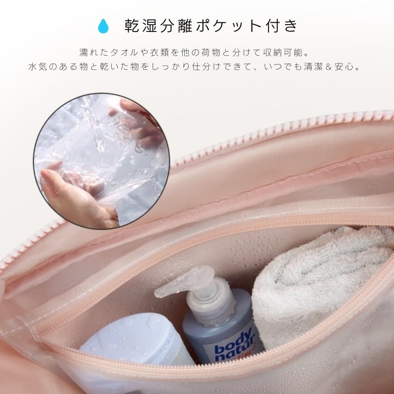 濡れたタオルやボトルを分けて収納できる「乾湿分離層」で、衛生的に使えます。