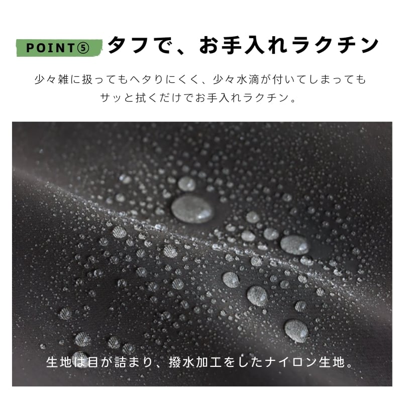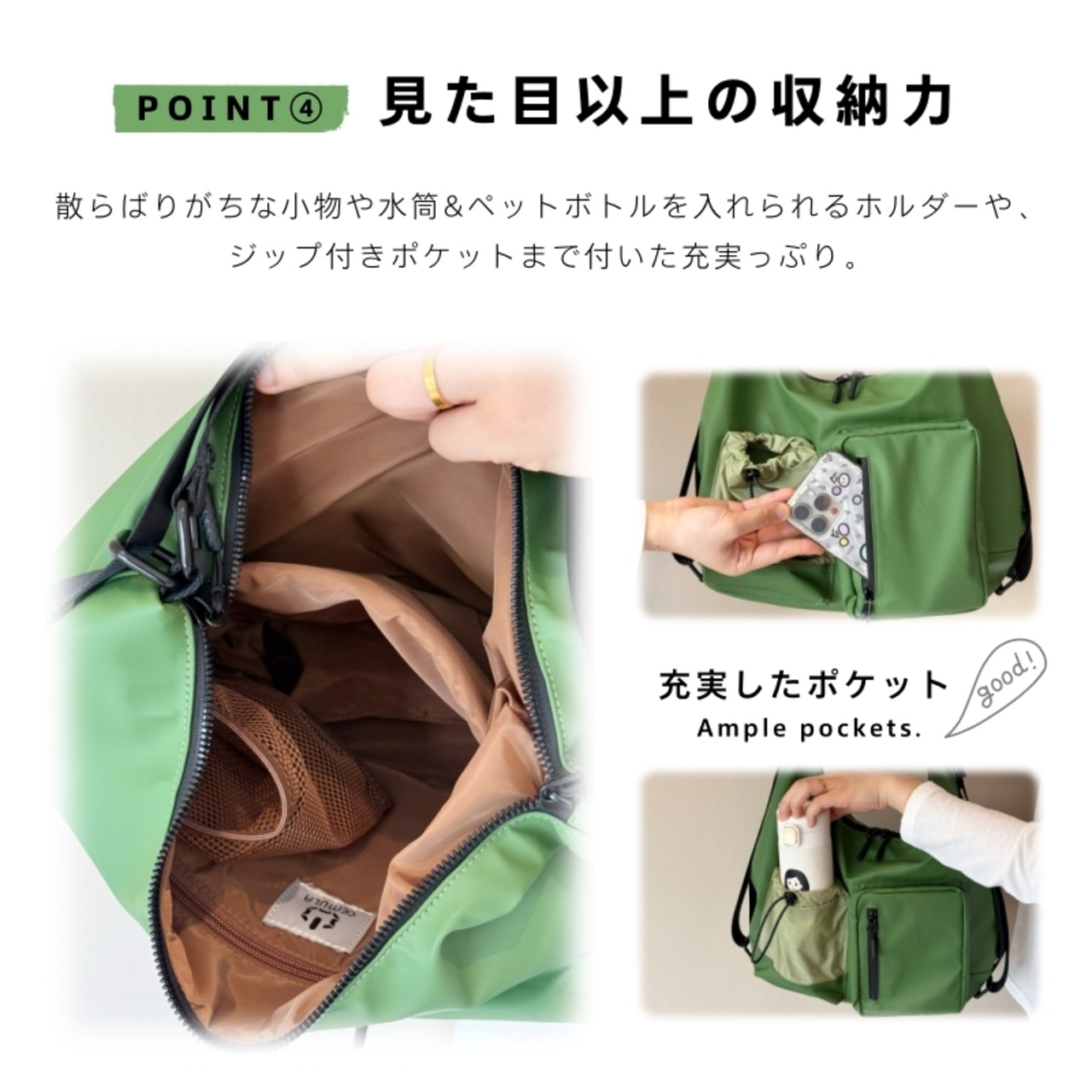 サイドに設けられた自立型ポケットは、水筒や傘をさっと出し入れできる便利さ。中身が倒れにくい設計で、中の飲み物をこぼす心配も軽減します。