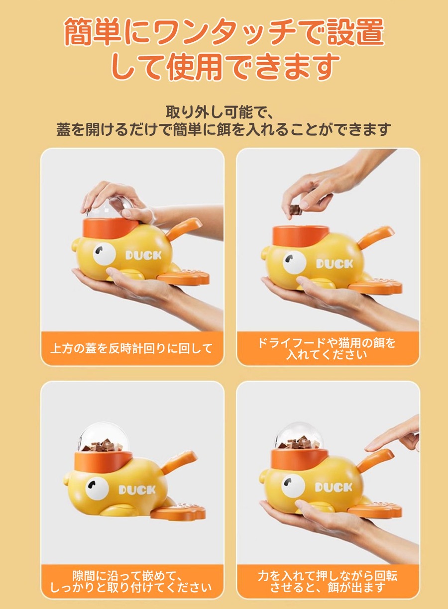 可愛いアヒルの形とコンパクトなサイズで、お部屋の隅にぴったり収まります。クリアな窓がペットの好奇心を刺激し、3種類の穀物出口で、異なるサイズと量のスナックに対応できます。