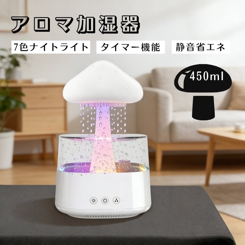 Y 152 . アロマ加湿器 マッシュルームクラウド アロマディフューザー 雨音 7色ナイトライト タイマー 静音 省エネ Type-C 450ml ベッドサイド オフィス ギフト | COCOFID