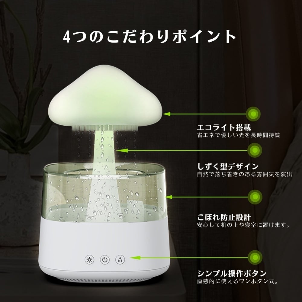 見ているだけで癒やされるマッシュルーム雲から、本物のように雨が降り注ぎます。その音と、ほのかな光、そして好きな香りが、あなたのデスクやベッドサイドを最高の安らぎ空間に変えます。