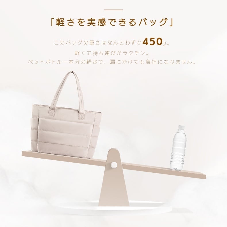 約450gの軽さで、肩にかけても疲れにくく、長時間持ち歩いても安心。