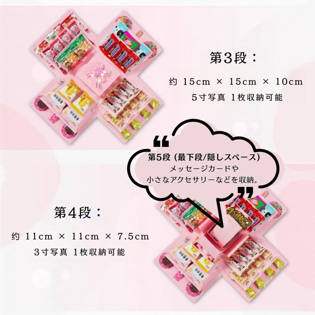 写真だけではなく、各段にキャンディやチョコレート、小さなアクセサリー、手紙などを入れれば、宝箱のような楽しさに。アイデア次第で用途が広がります。