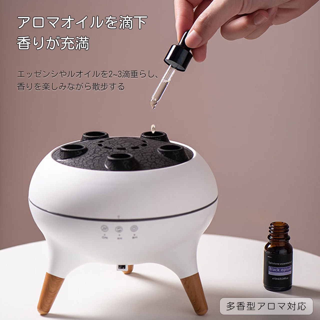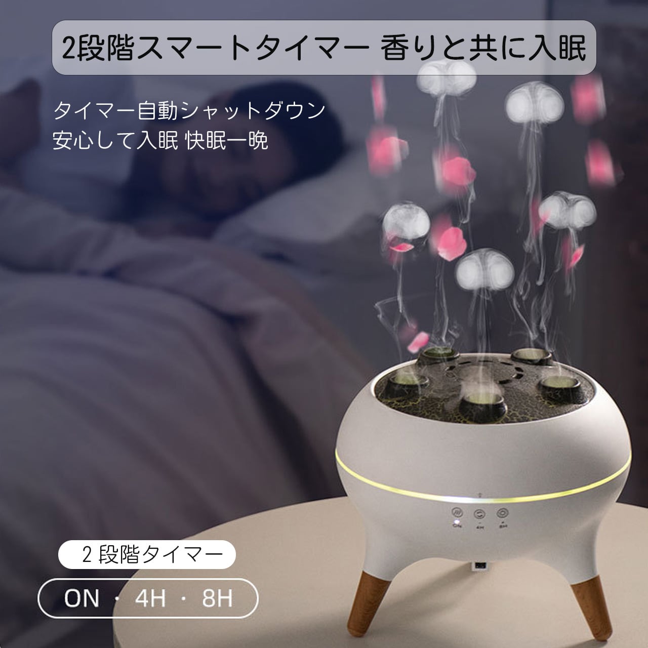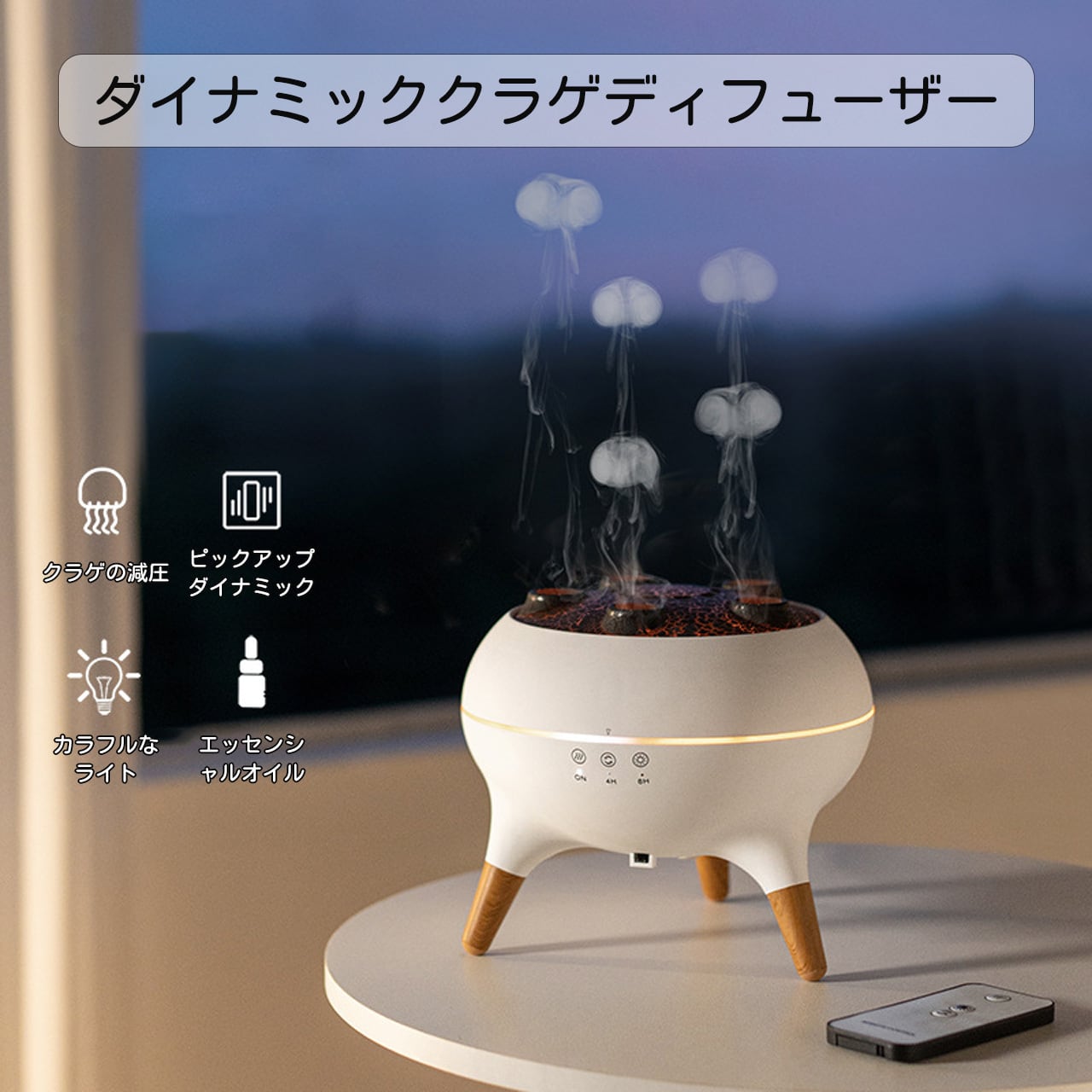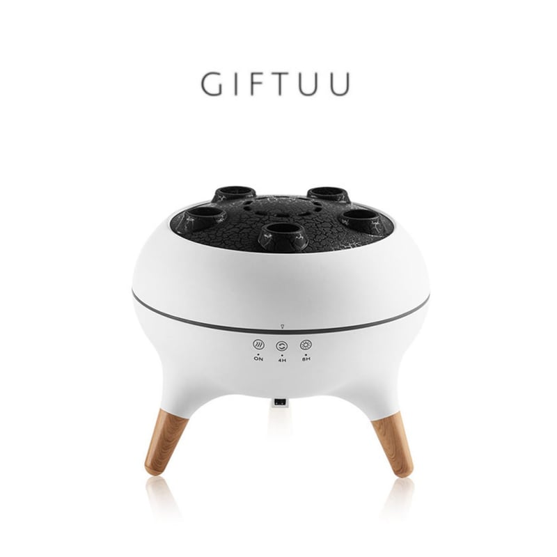クラゲのような繊細なフレームデザインと火山の景観を融合させたユニークな造型。5 つの噴霧口から立ち上る霧化が幻想的な雰囲気を演出し、底部の木目調ディテールが高級感を際立たせています。インテリアに溶け込む北欧スタイルのデザインで、どの季節でも部屋の雰囲気を変えることができます。