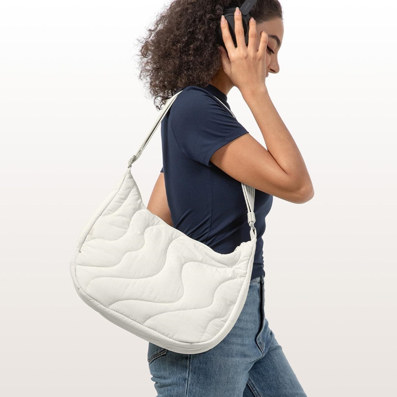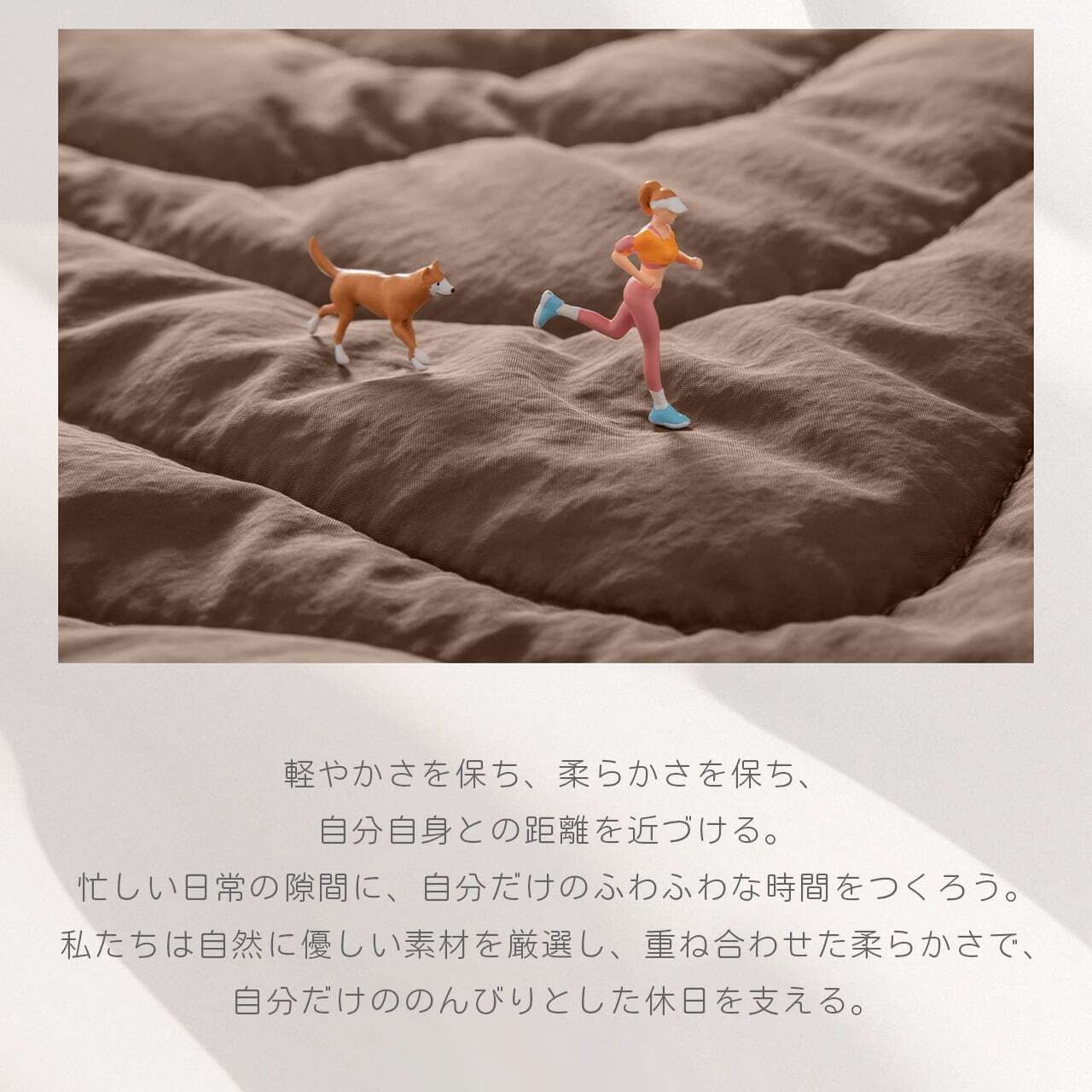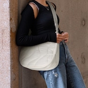 肌理感ナイロンが中綿を優しく包み込み、中身を守りながら持ち手にもふんわりとした心地よさを持続。触りたくなる柔らかさです。