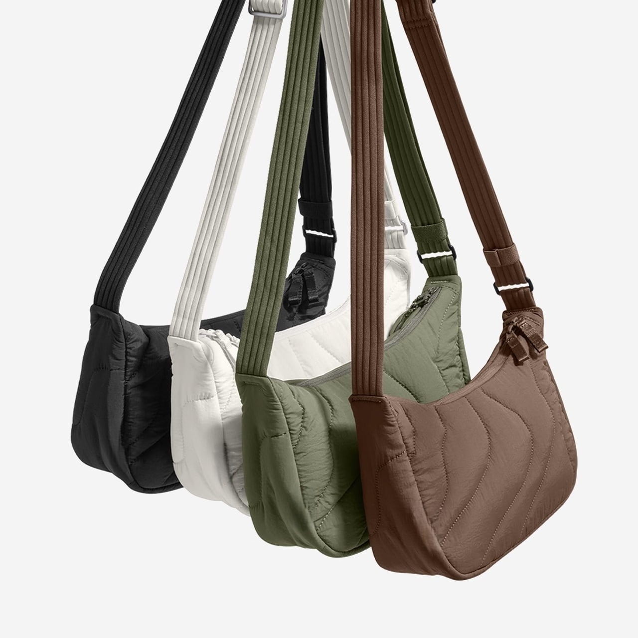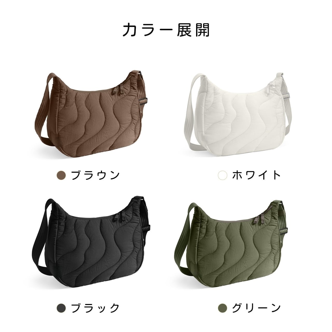 ブラウン・ホワイト・ブラック・グリーンの4色。シンプルなデザインだから、どんな服装にも自然に溶け込みます。