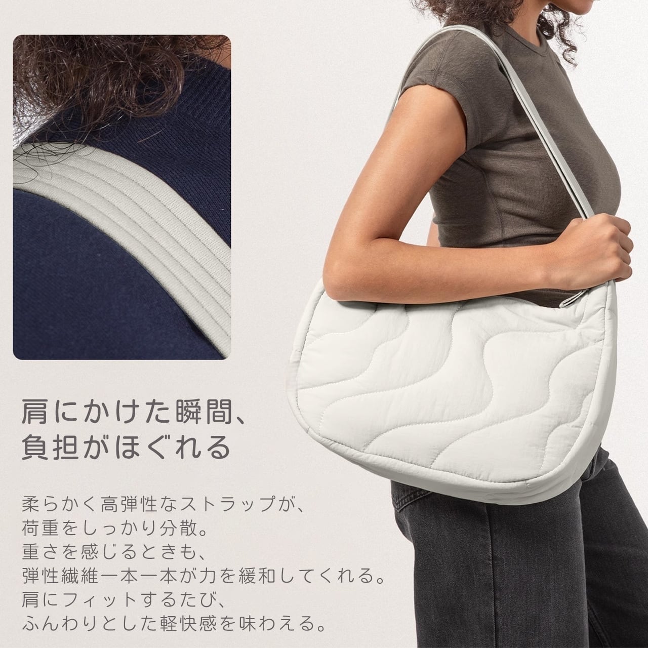 柔らかくも強い弾性ストラップが、荷物の重みを分散。長時間かけても肩が痛くなりにくい、軽やかな掛け心地です。