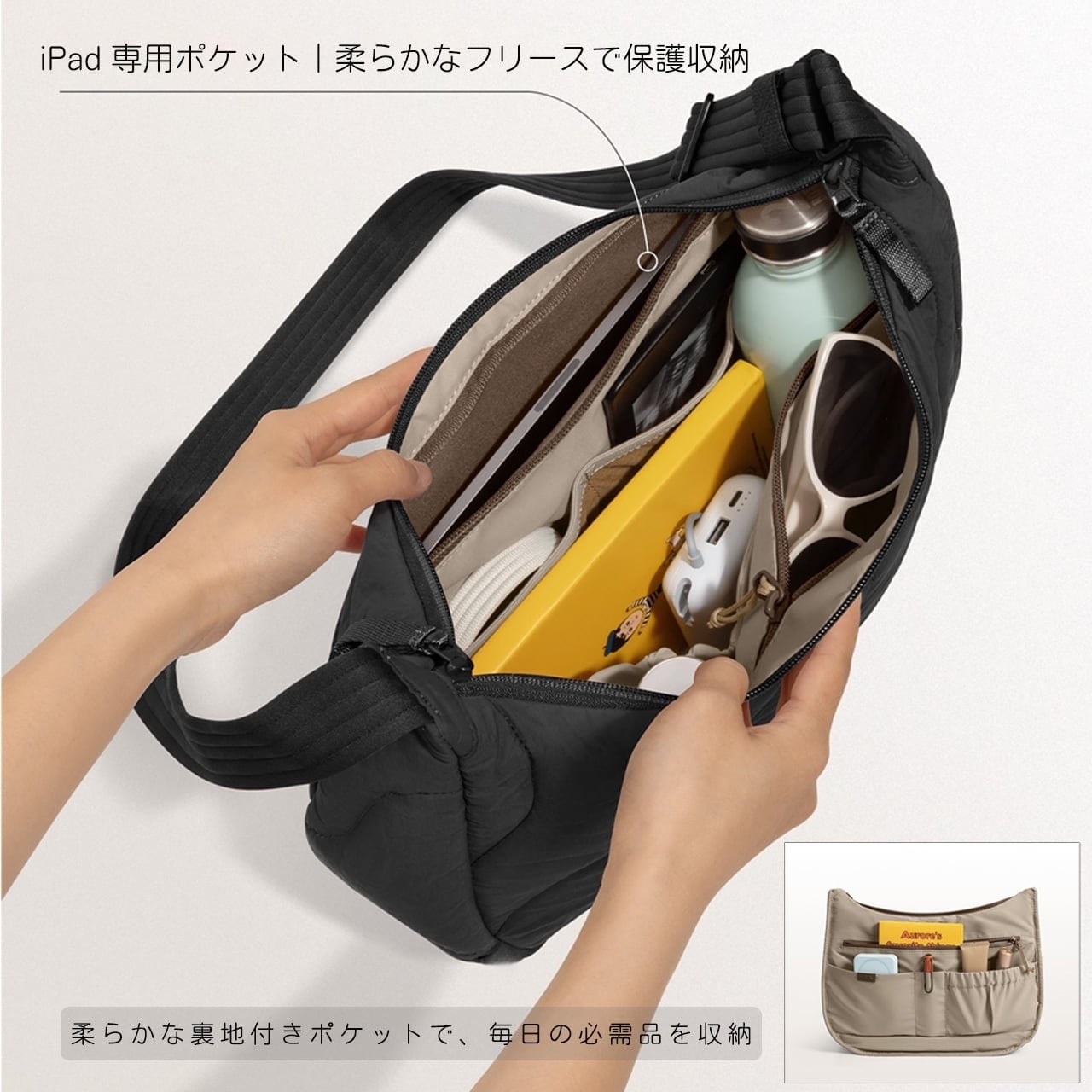 柔らかなフリース裏地付きポケットを内蔵。11インチiPadを擦れや衝撃から守りながら、すっきり収納できます。