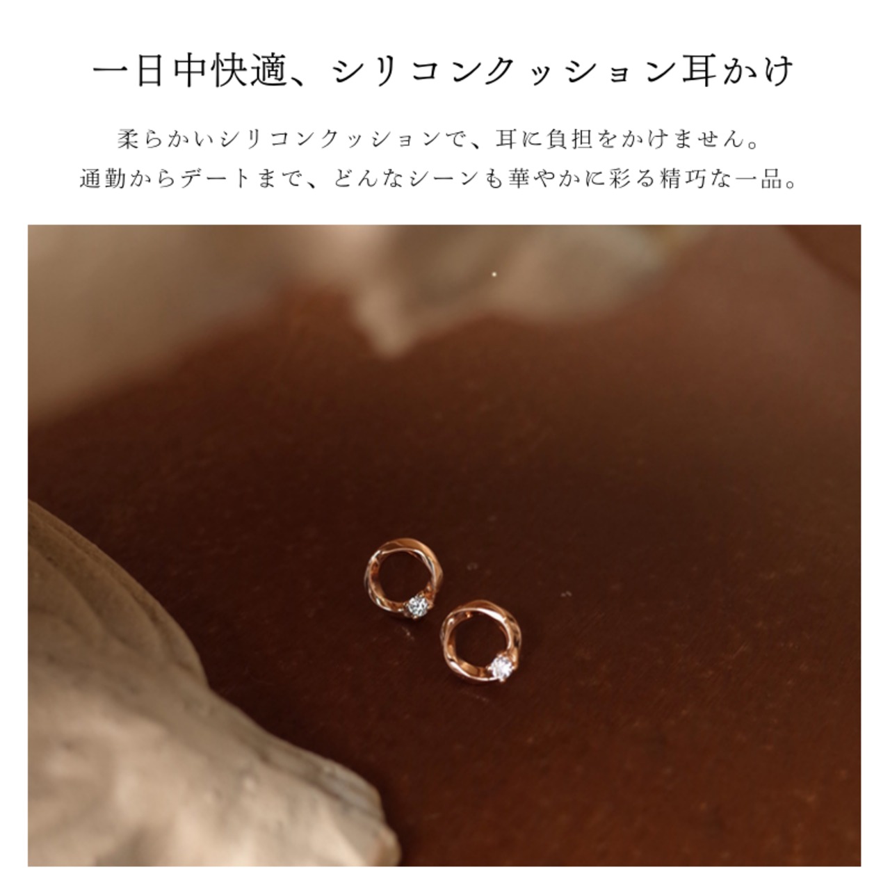 幾何学的なモビウスリングとシンプルなシングルストーンの2デザイン。オフィスでの通勤スタイルから、デートやちょっとしたお出かけまで、どんな服装にも自然に溶け込みます。