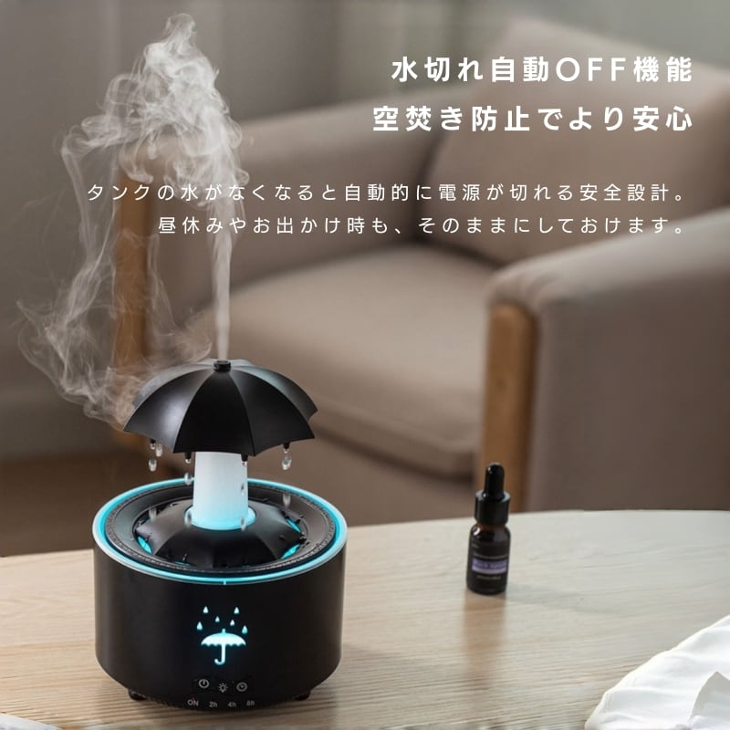 ワイヤレスリモコンで、電源、光、タイマー、霧量を離れた位置から調節可能。また、水がなくなると自動で電源が切れる空焚き防止機能付きで、昼休みや就寝時も安心してご使用いただけます。