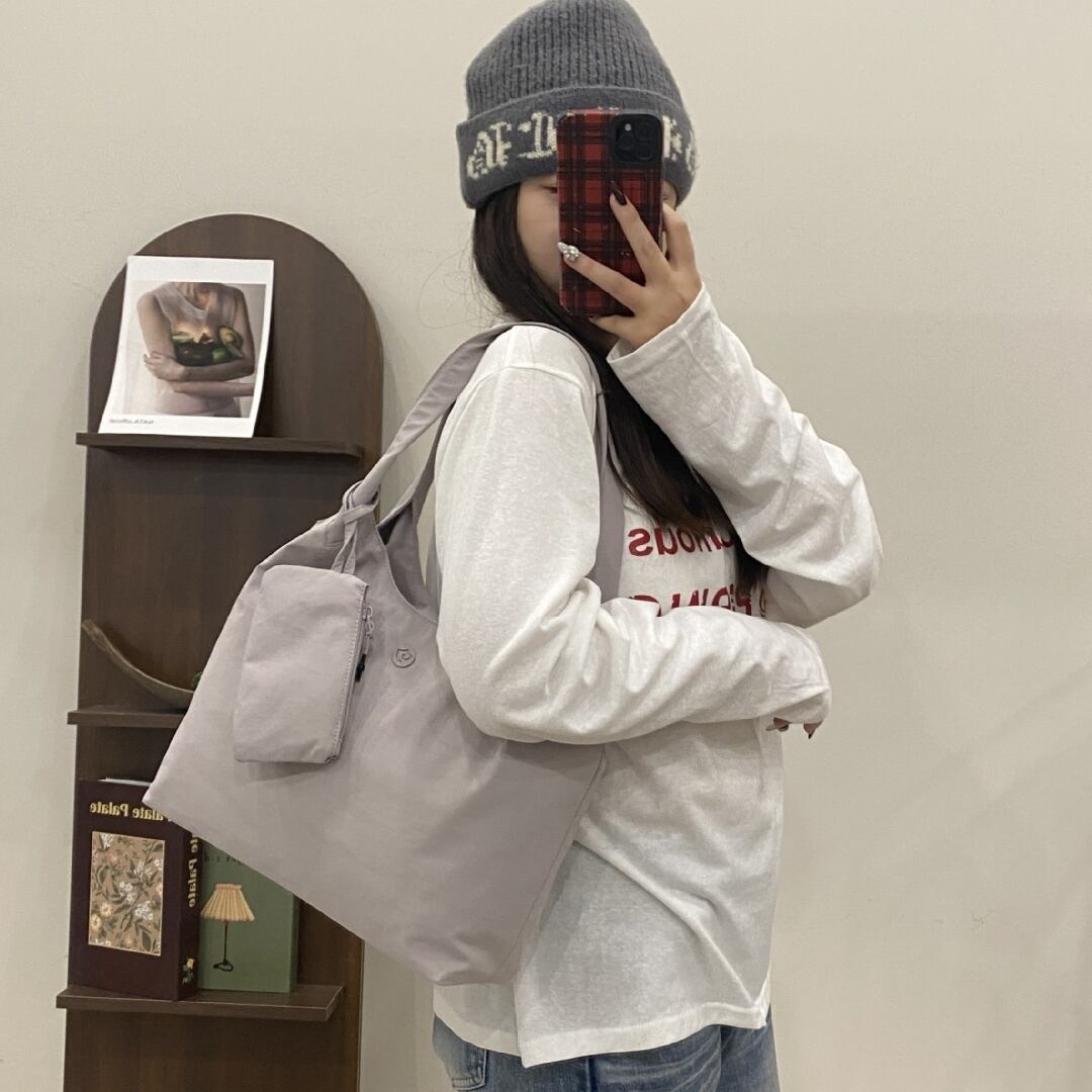 付属のストラップで肩にかけても、ショートハンドルとして手に持っても使い勝手が良い、便利な1枚です。