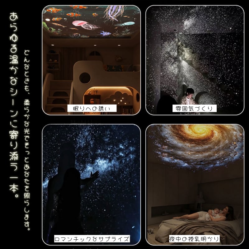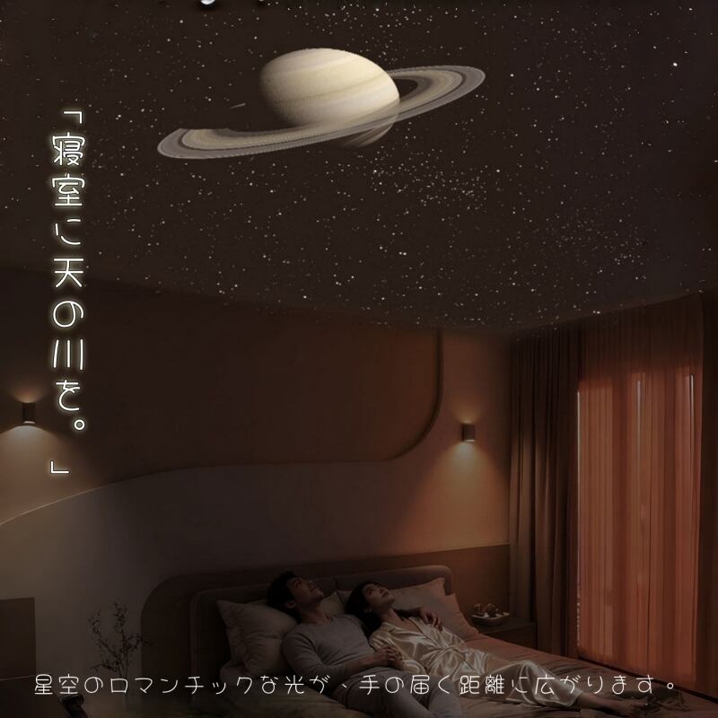 フルスペクトルに近い目に優しい光で、ベッドサイドの常夜灯として、また天井いっぱいに広がる星空プロジェクションとして、ワンタッチで切り替えてお楽しみいただけます。