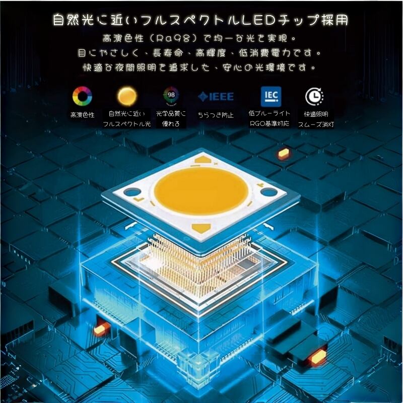 自然光に近いRa98の高演色性光源を採用。ブルーライトを低減し、ちらつき(フリッカー)を抑えた設計で、就寝前のリーディングライトや子どもの見守り灯りとしても安心です。