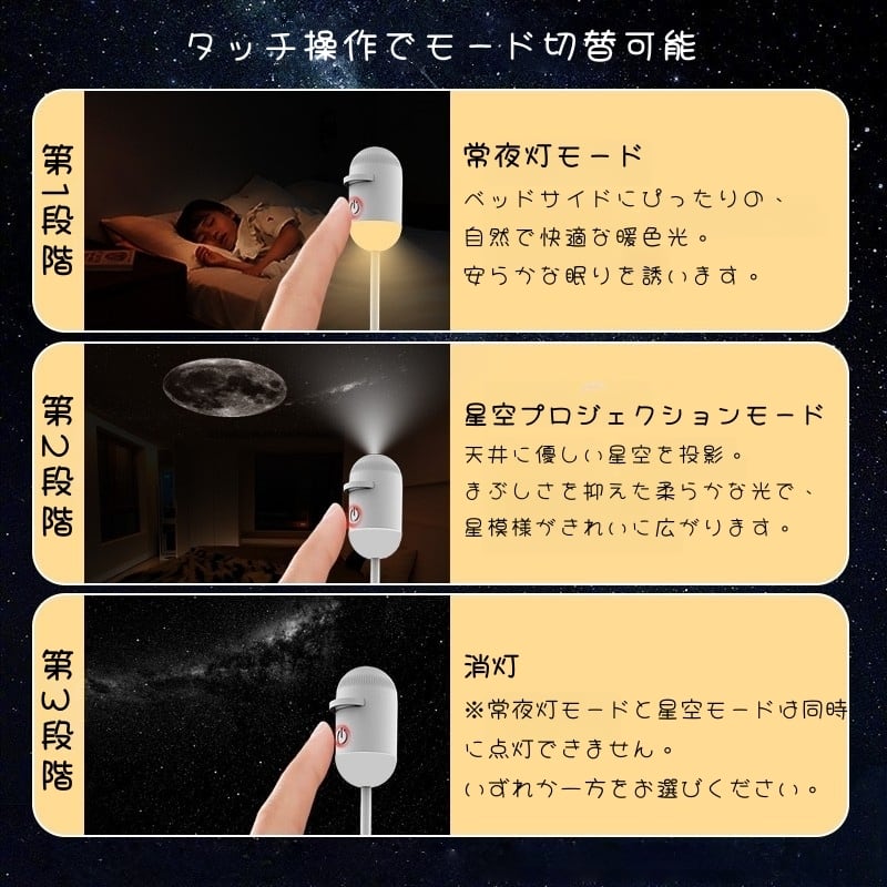 ■ 調光・操作:タッチセンサー式(3段階切替:常夜灯/星空投影/消灯)