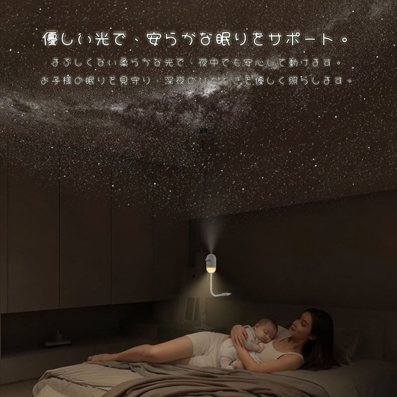 就寝時の安心灯りとして、お子様の寝かしつけや夜中の授乳はもちろん、大人のリラックスタイムやムーディーな空間作りにもぴったり。