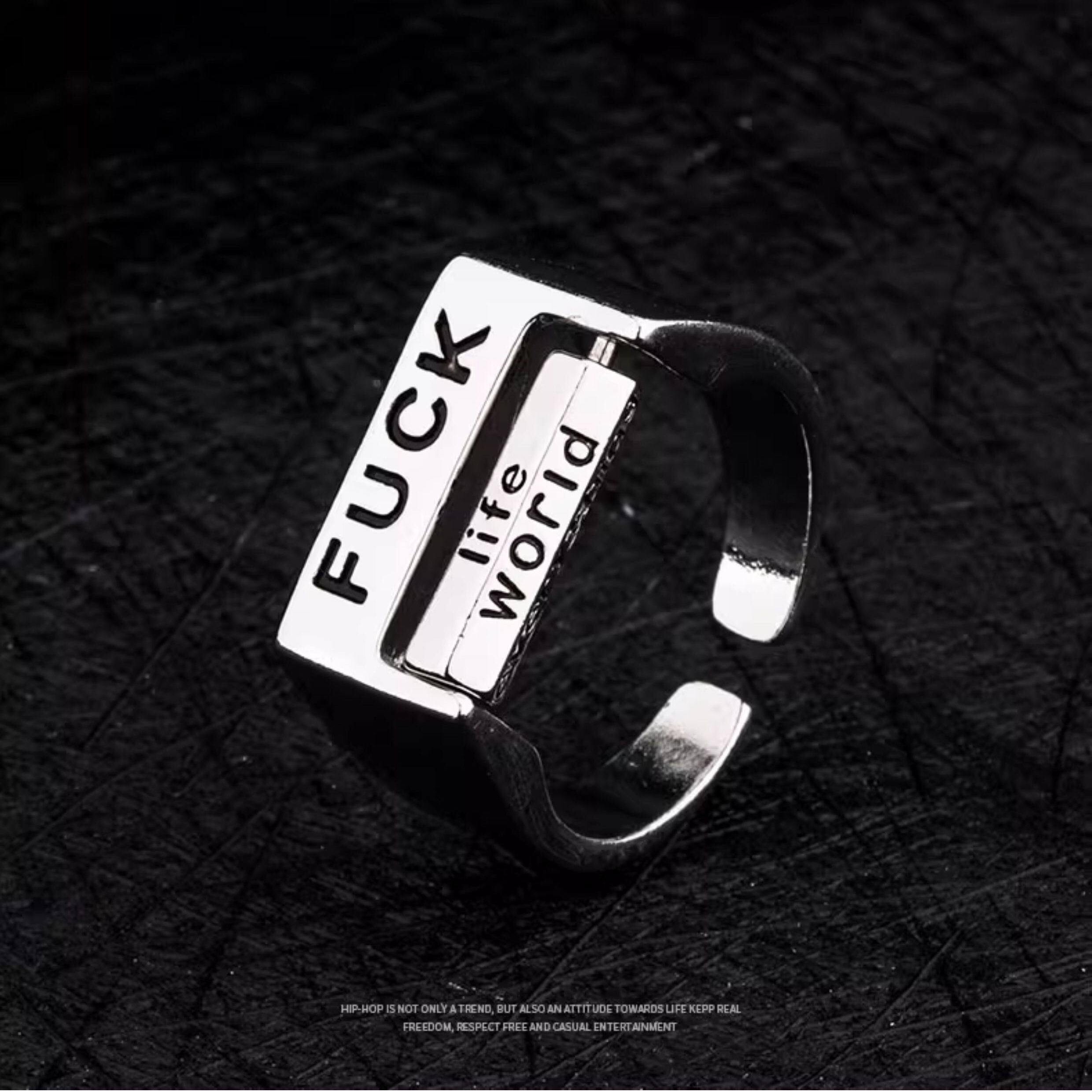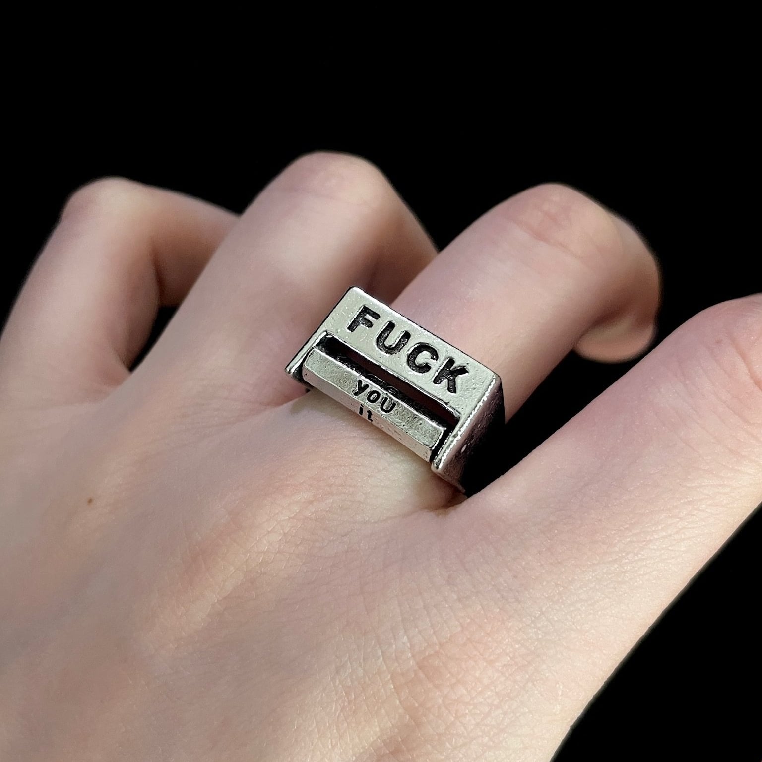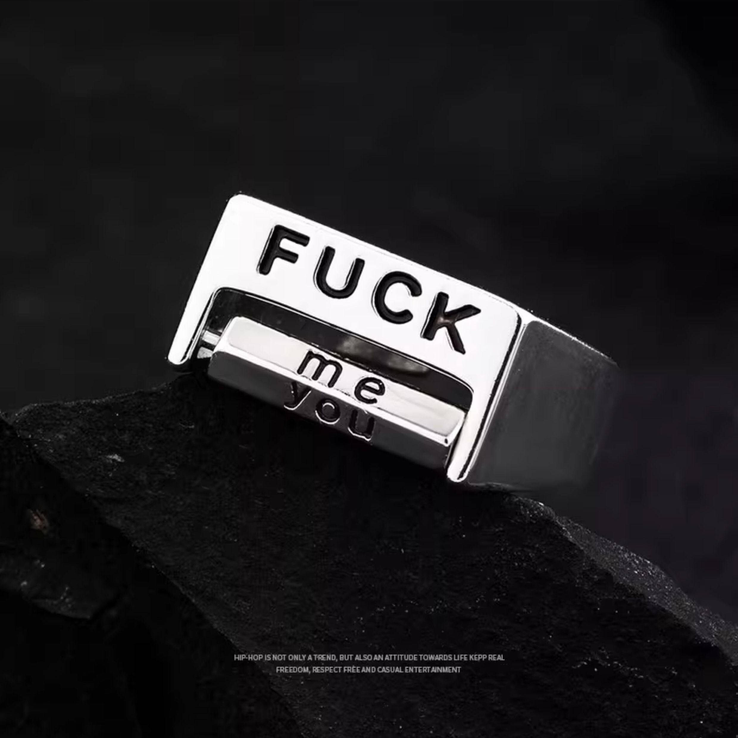 シンプルなチタンスチール製の指輪に、大胆な「FUCK」の刻印。