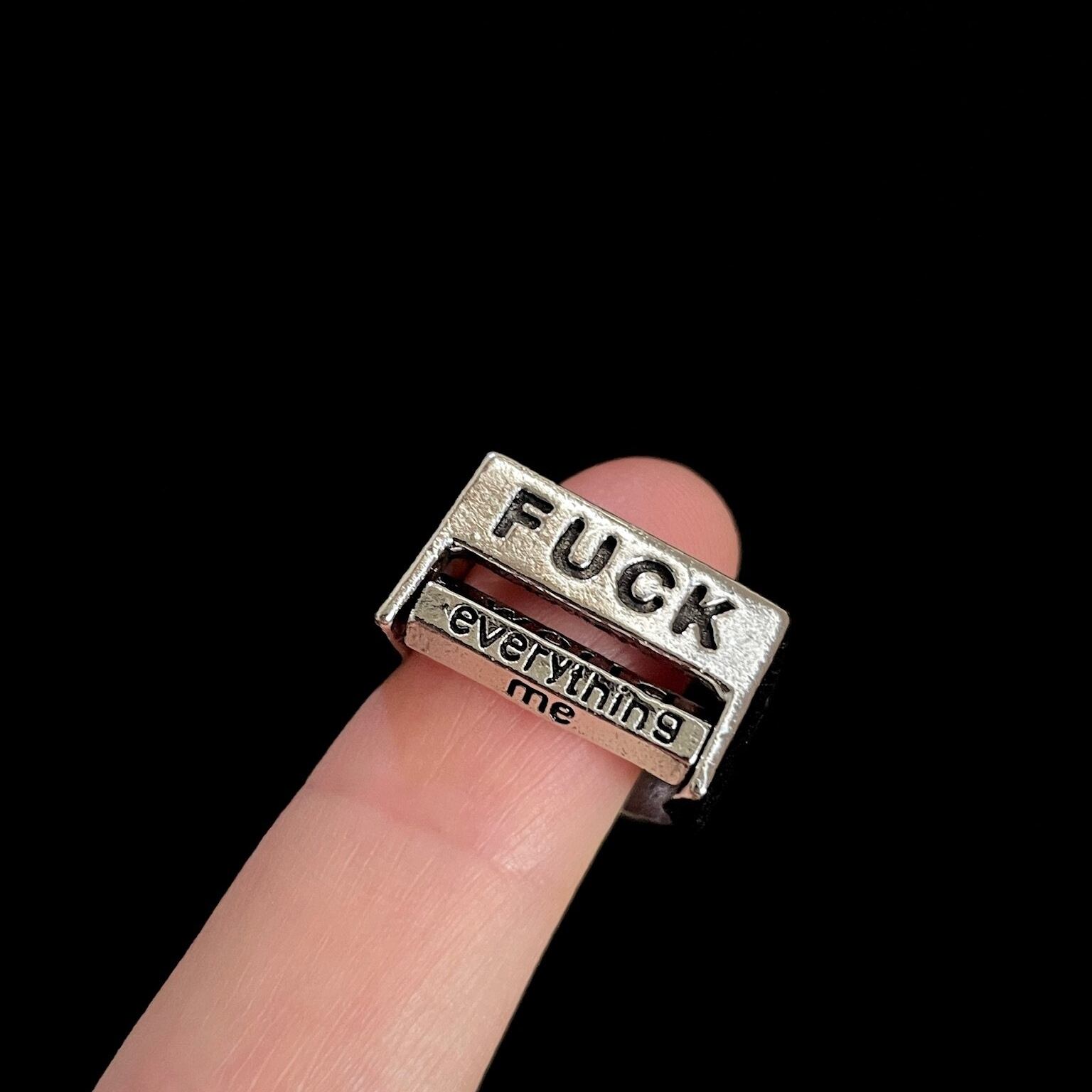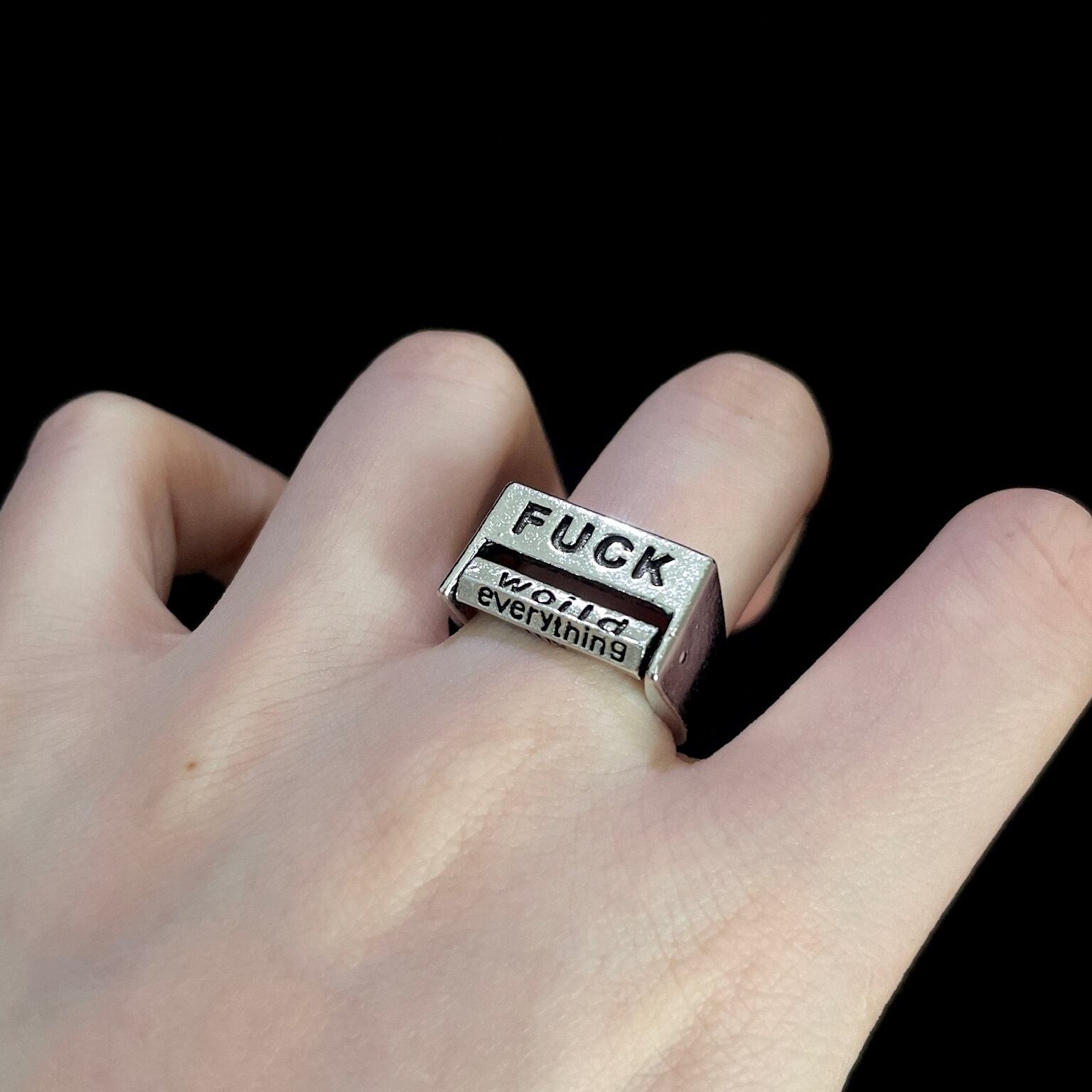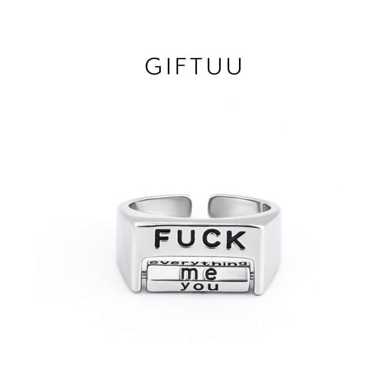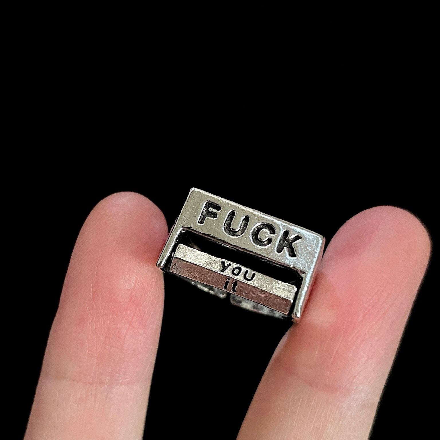 シンプルなチタンスチール製の指輪に、大胆な「FUCK」の刻印。