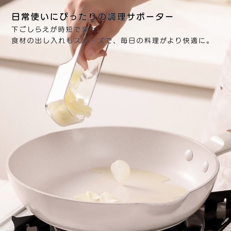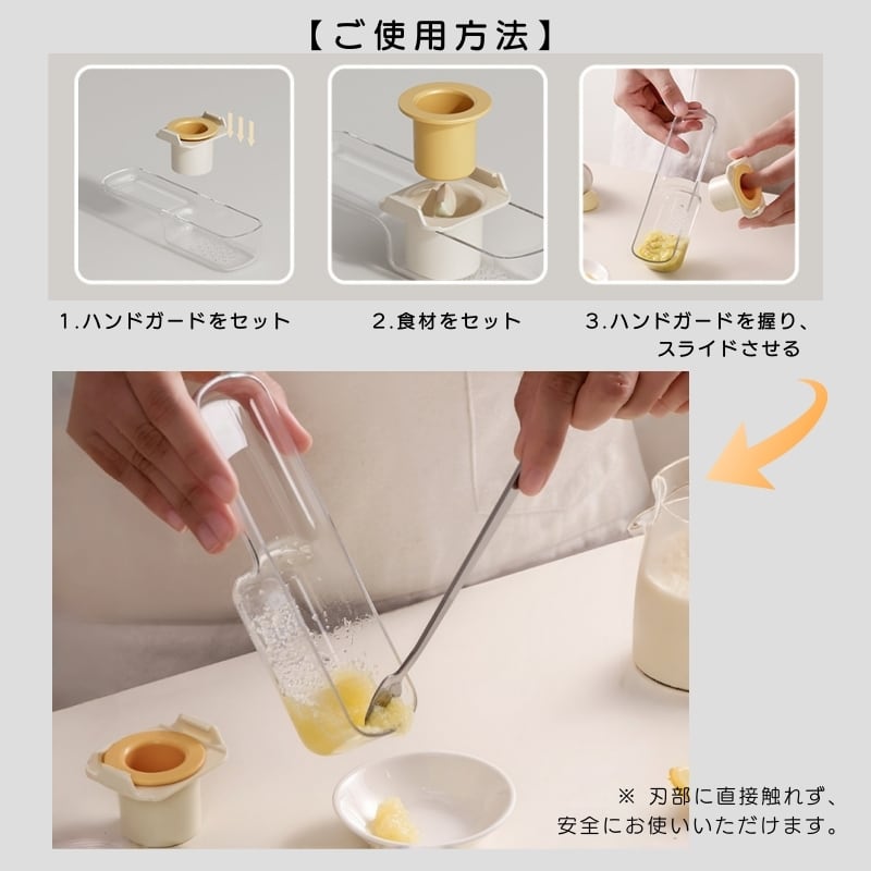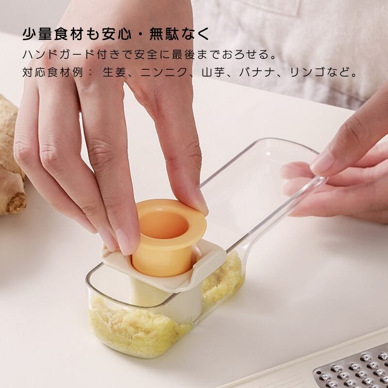 刃に直接触れる心配がなく、小さい一片のニンニクや生姜も最後まで安心しておろせます。無駄なく、安全に使い切れる設計です。
