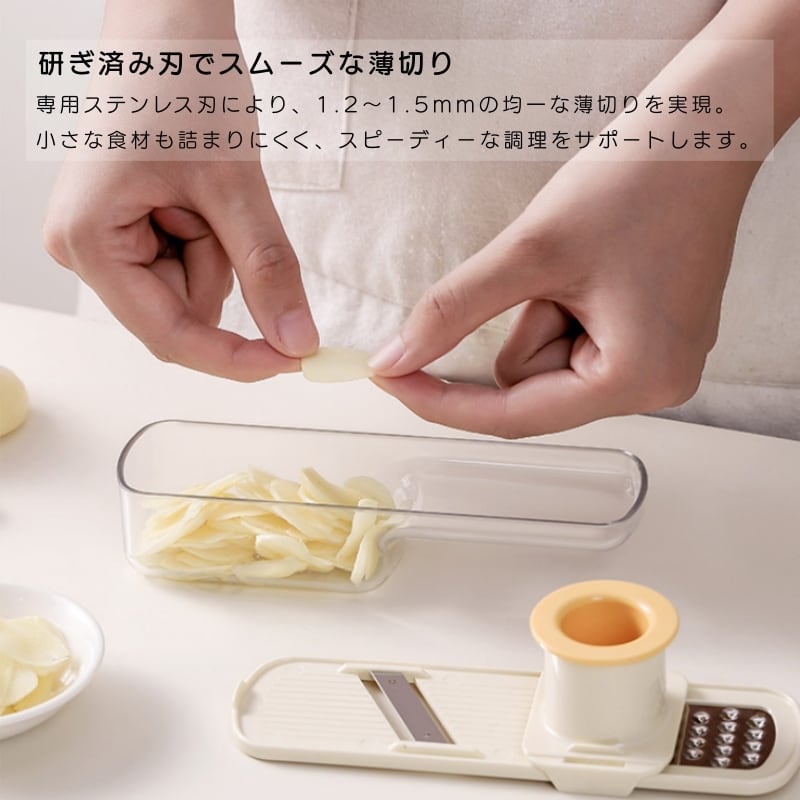 スライス (1.2-1.5mm刃):薄切りから厚切りまで、均一なスライスを簡単に。