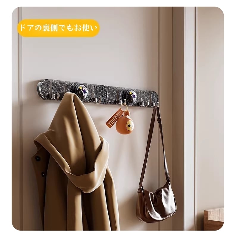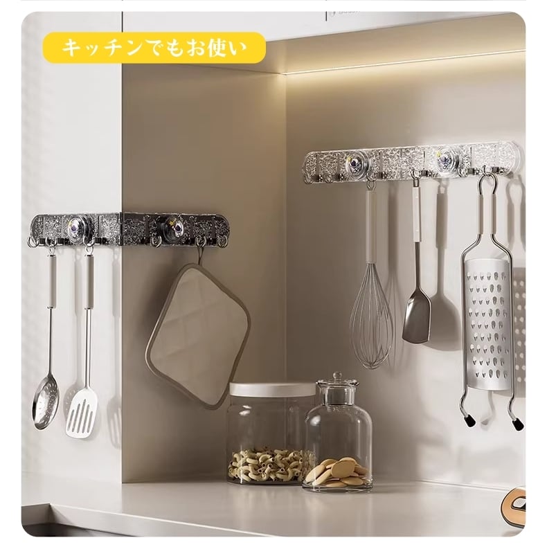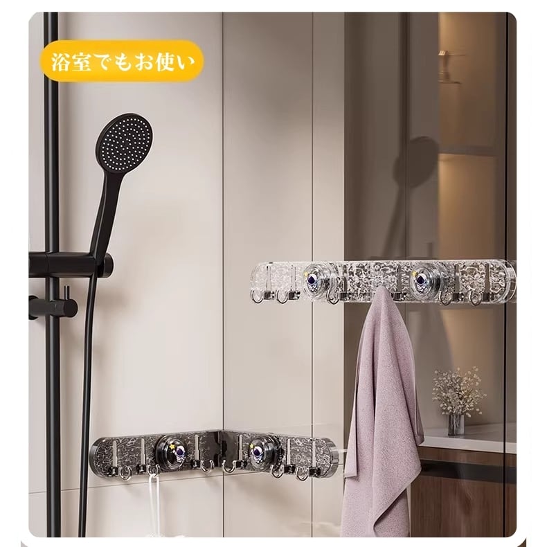 フックが自由に回転し、90度の角にもぴったり設置可能。タオル、鍋つかみ、小物など、あらゆる物の収納に活用でき、死角スペースを有効活用します。