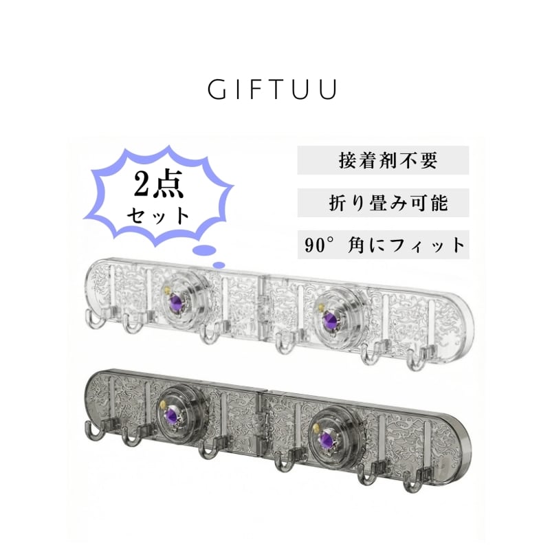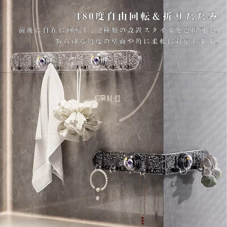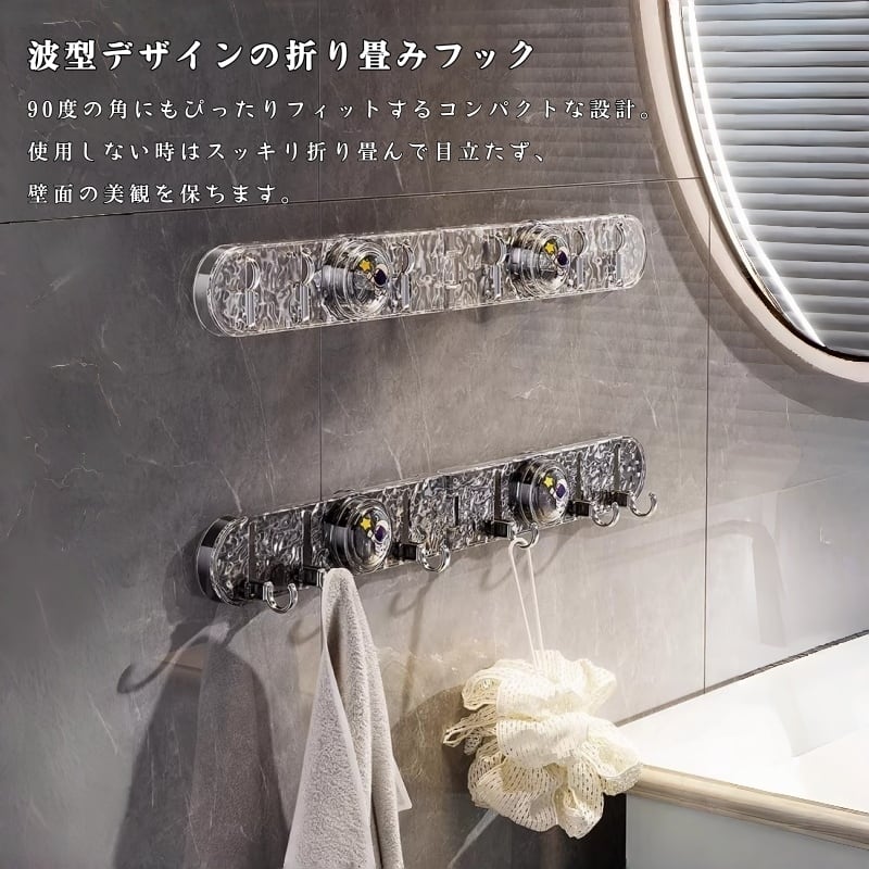 Y 224 . 真空吸盤 フック 2点セット 折り畳み 多機能 水波デザイン 接着剤不要 強力吸着 耐荷重 防水 浴室 キッチン 収納 インテリア 壁掛け 滑らかな壁面用 繰り返し使える | COCOFID