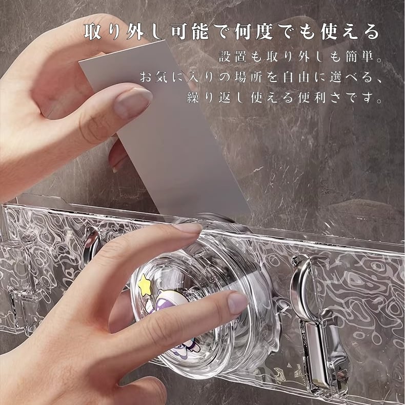 ドリル不要、接着剤不要。シリコン吸盤が真空状態を作り出し、滑らかな壁面に強力に吸着。取り外しも簡単で、跡形も残しません。