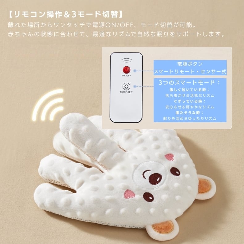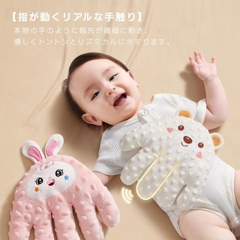 本物の手のような柔らかい動きで、リズミカルに優しく拍動。赤ちゃんはまるで抱きしめられているような安心感を得られ、自然な眠りに誘導されます。