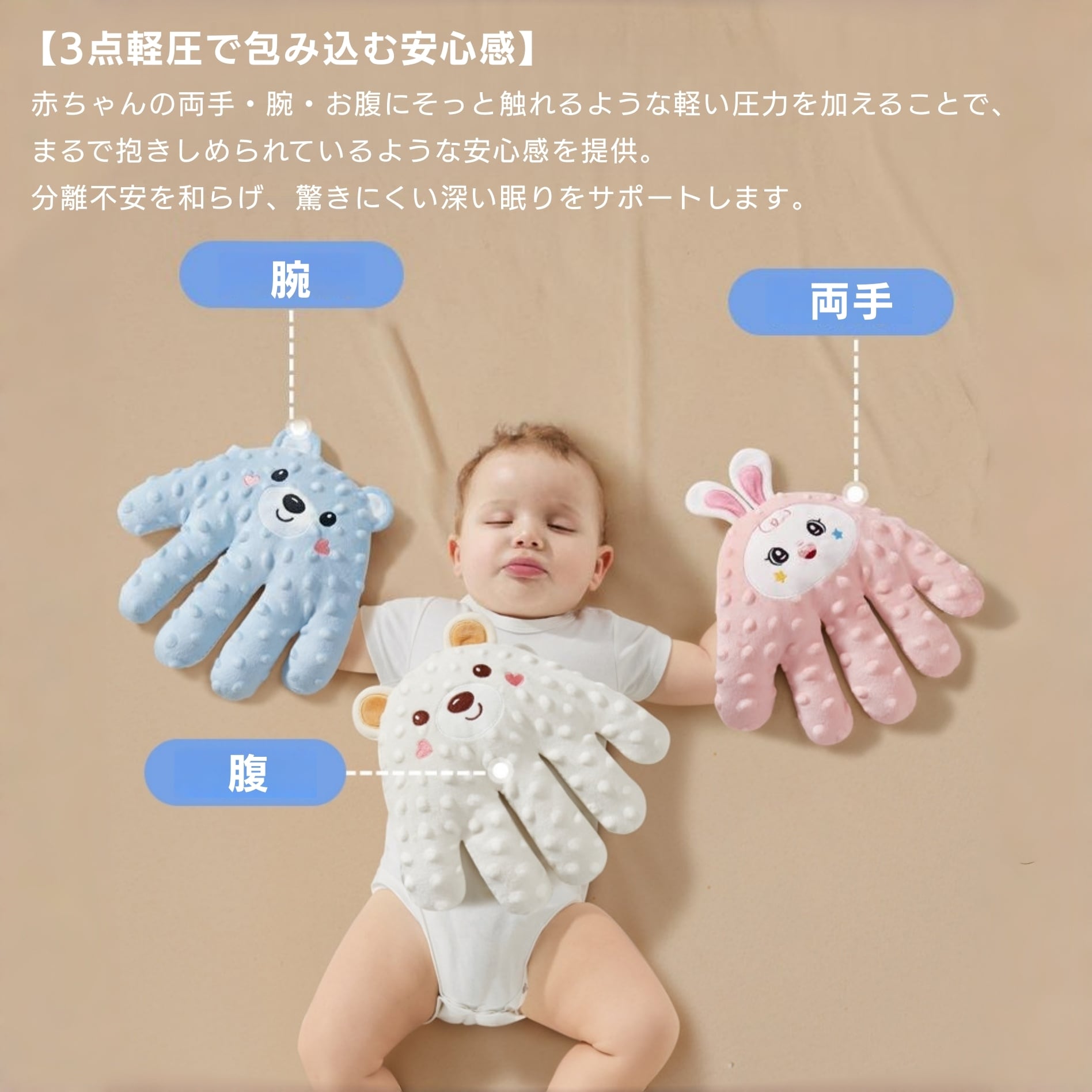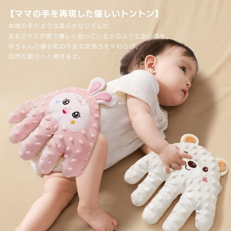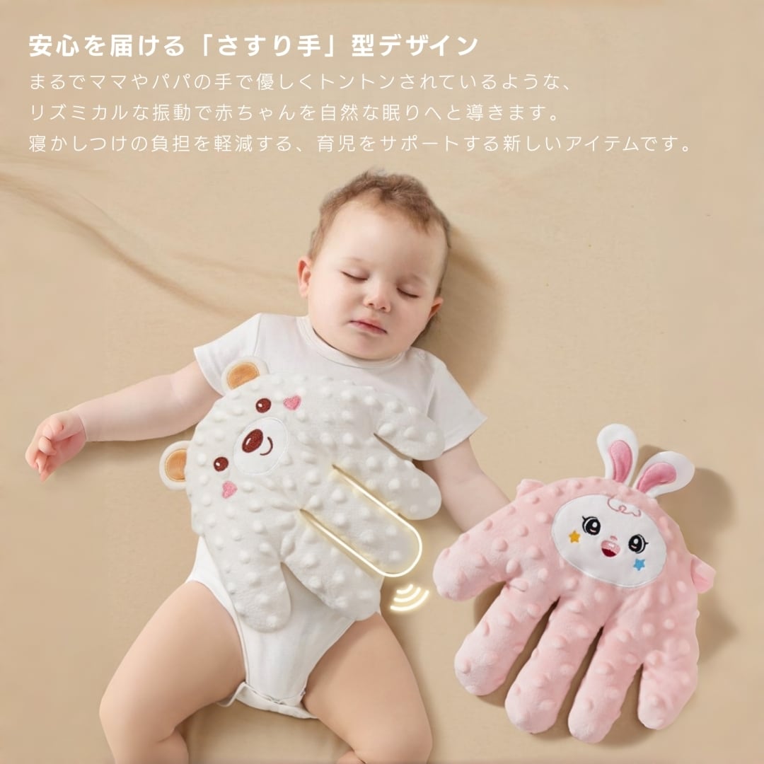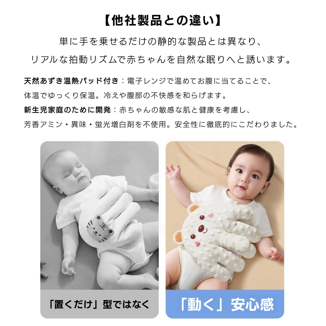 ただ置くだけのアイテムとは違い、リアルなリズムで優しく拍動する「さすり手」。モロー反射(びっくり反射)が気になる赤ちゃんも、包み込まれるような安心感でぐっすり。超長续航で、夜泣きが続く時も心強い味方です。