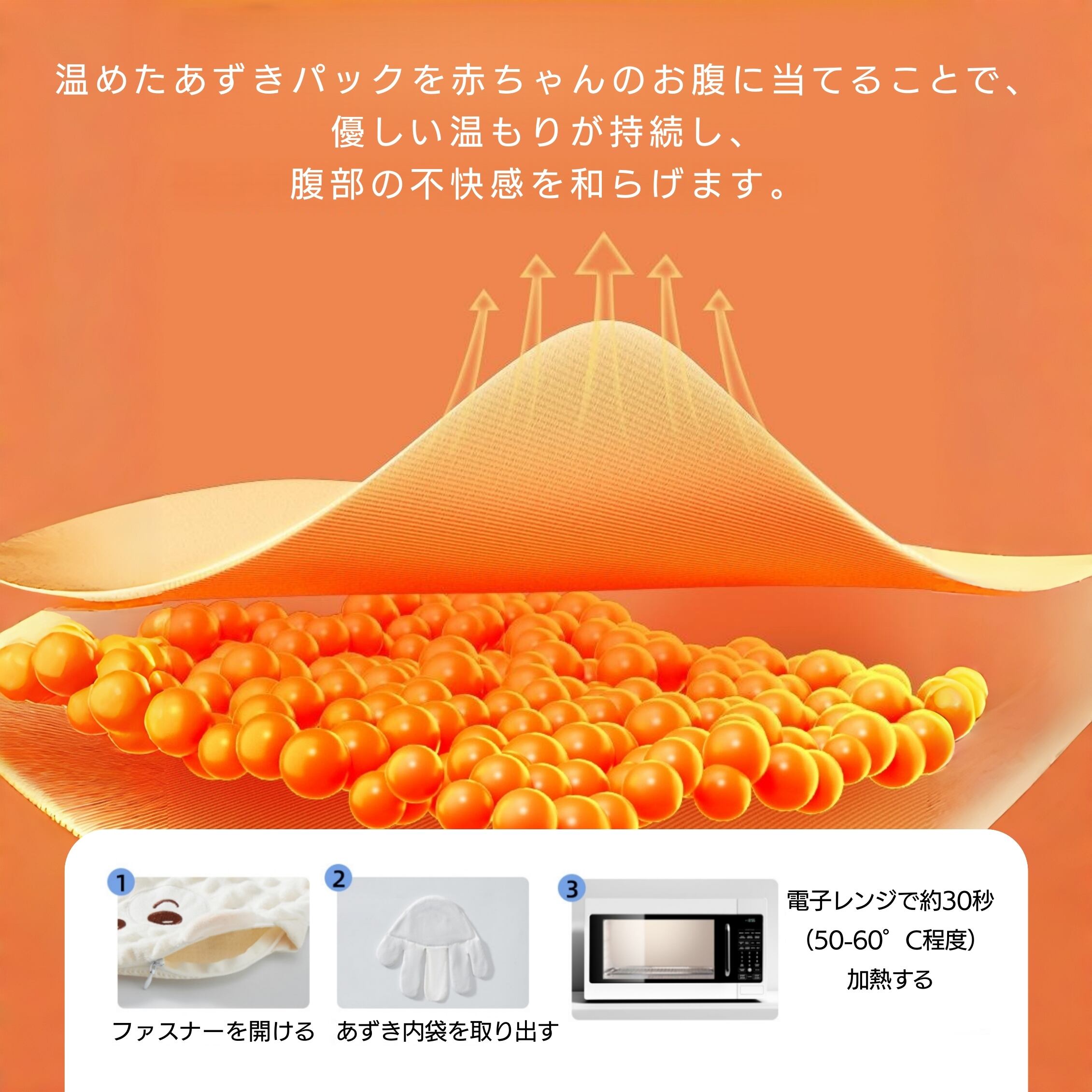 電子レンジで温めてお腹に当てるだけで、ママの手のようなじんわり温もりが持続。腹部の張りや冷えが気になる時に最適です。(※あずきパック本体は水洗い不可)