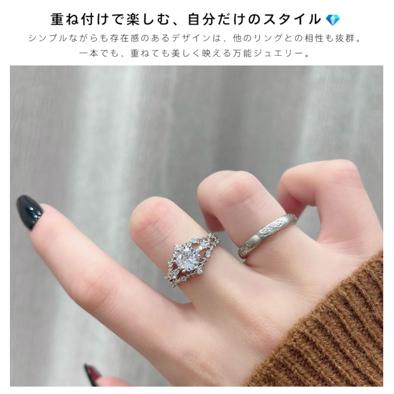 単独でも十分に映えますが、他のシンプルなバンドリングやデリケートなチェーンリングと重ねることで、より個性的でファッショナブルな雰囲気を演出できます。