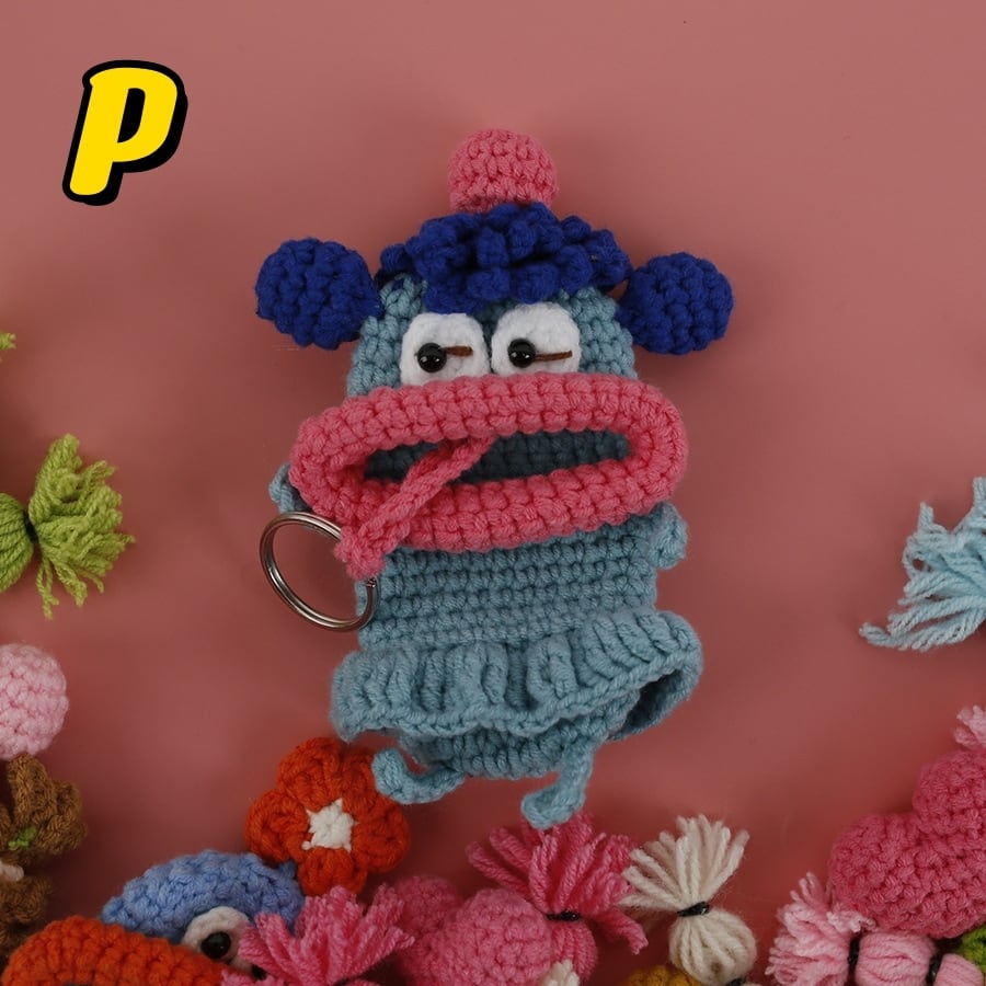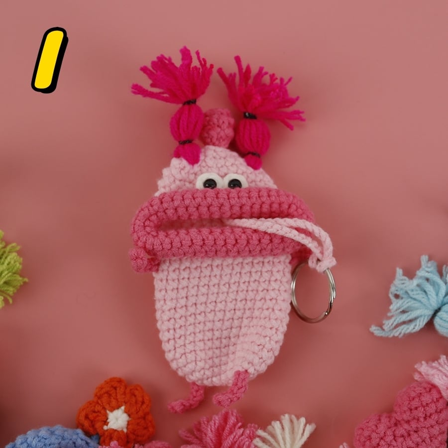 思わずクスッと笑ってしまう、愛らしい「ソーセージ唇」がチャームポイントの手編みキーケース。