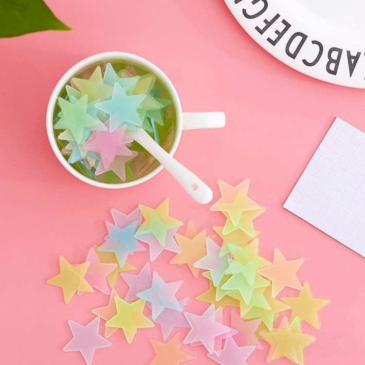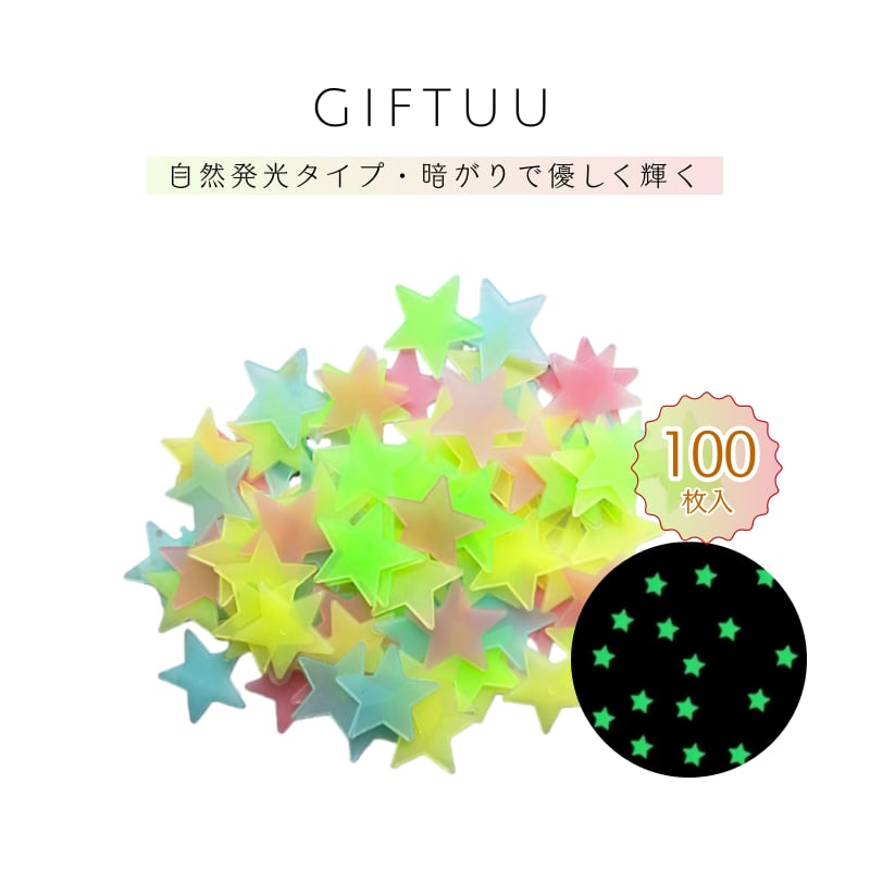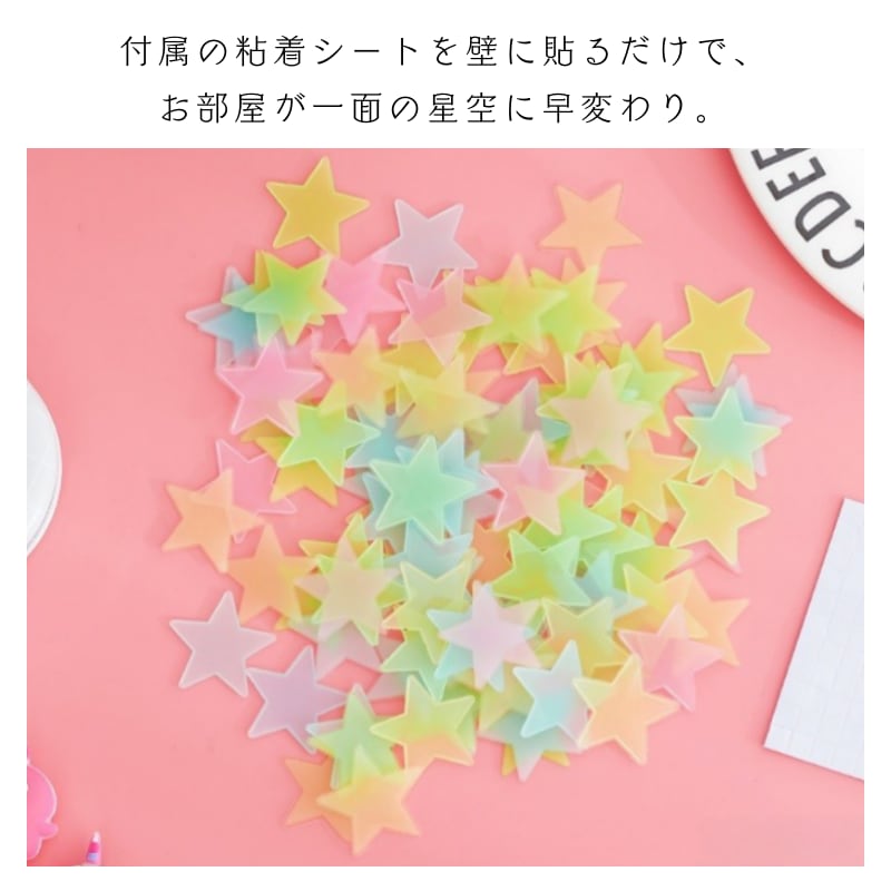 暗闇に優しく浮かび上がる100個の光る星が、お部屋を一瞬でファンタジーな星空に変えます。