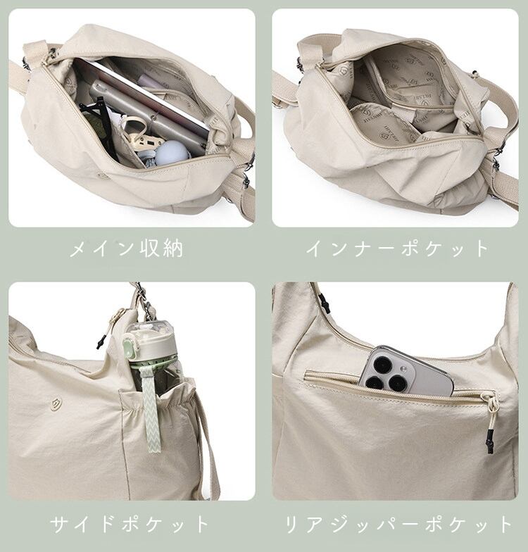 メイン収納、サイドポケット、インナーポケット、リアジッパーポケット