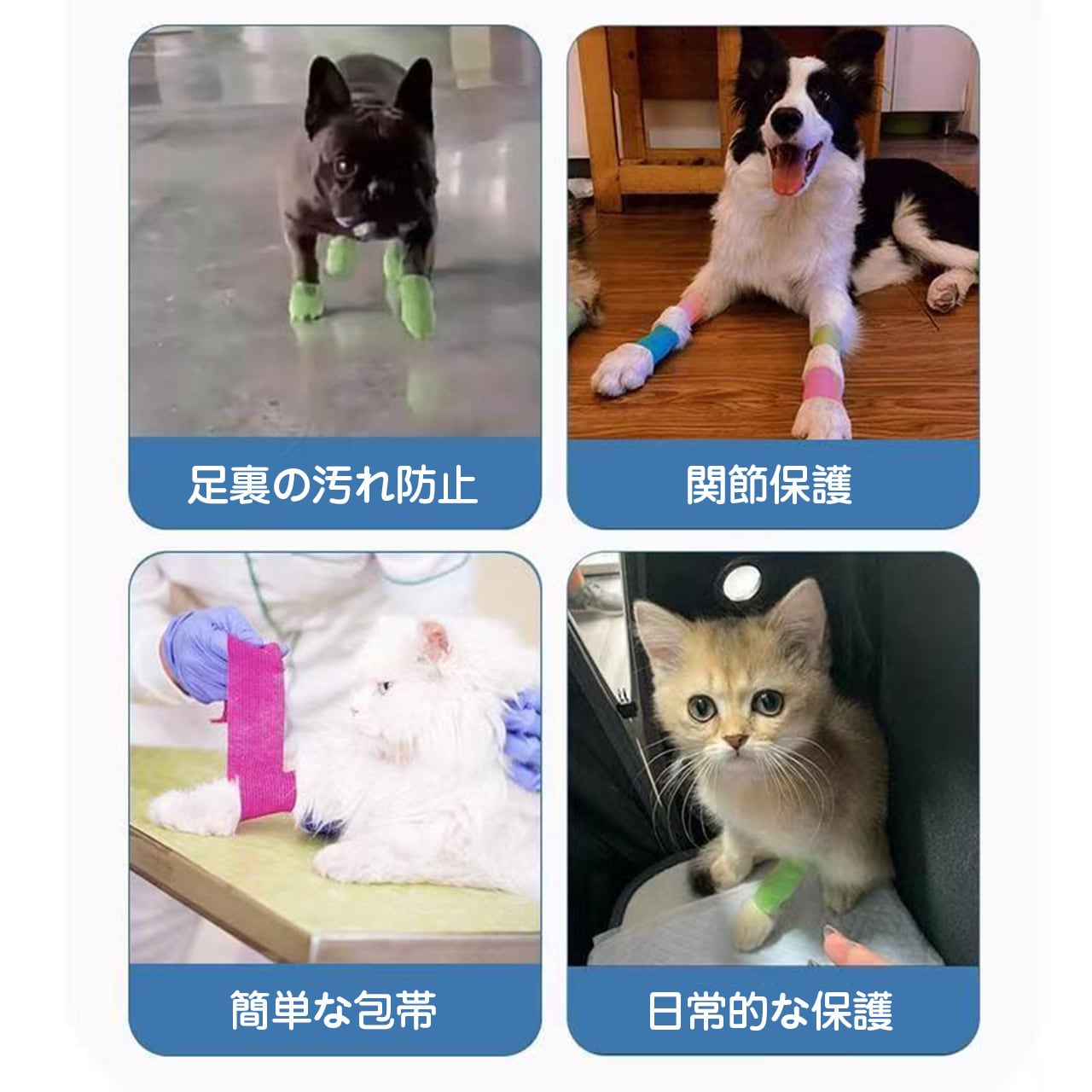 ■ 機能:四肢を固定し、適度な圧力で止血をサポートし、ケガの応急処置にも対応、外出時の汚れ防止にも使える