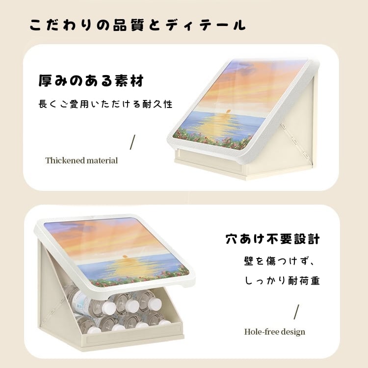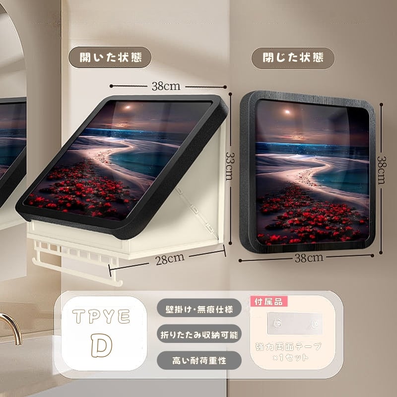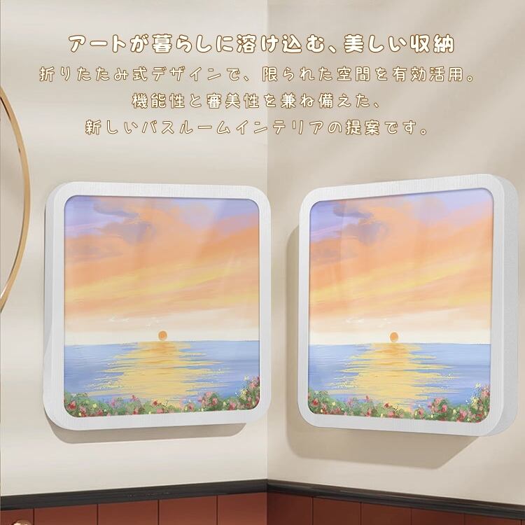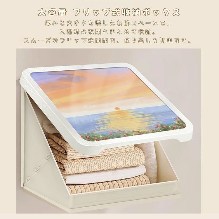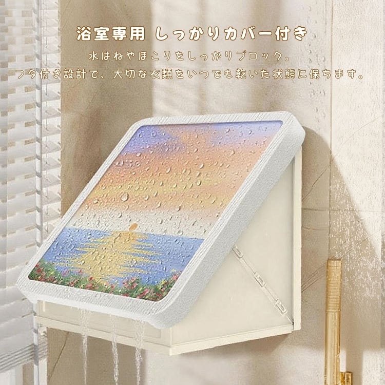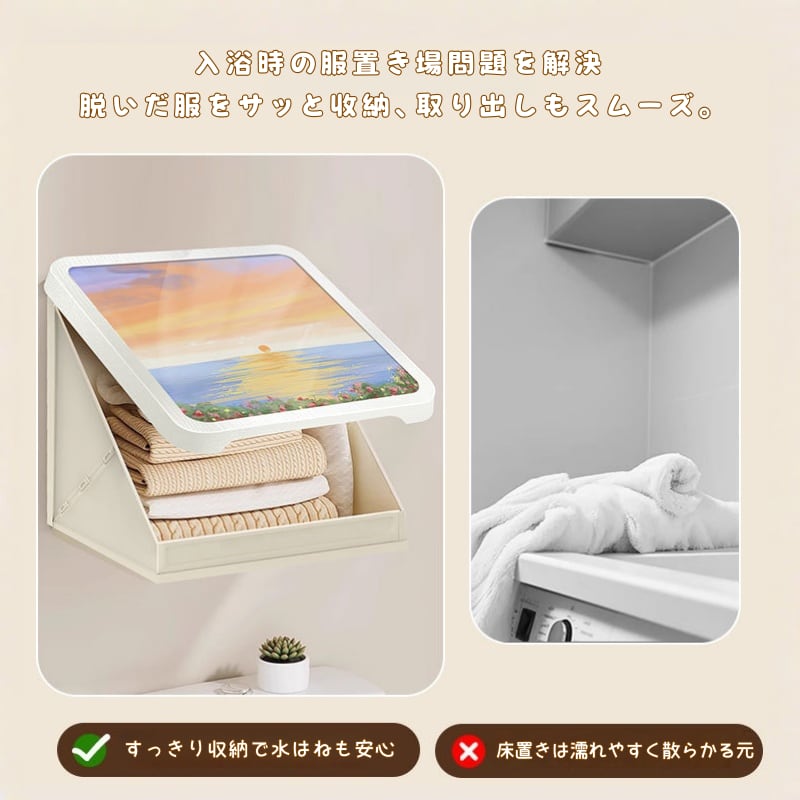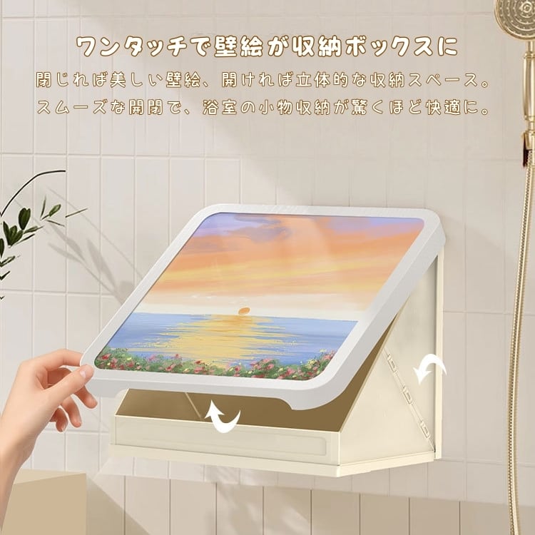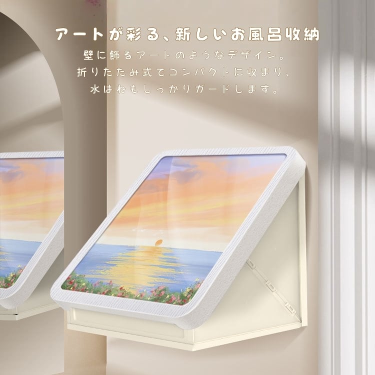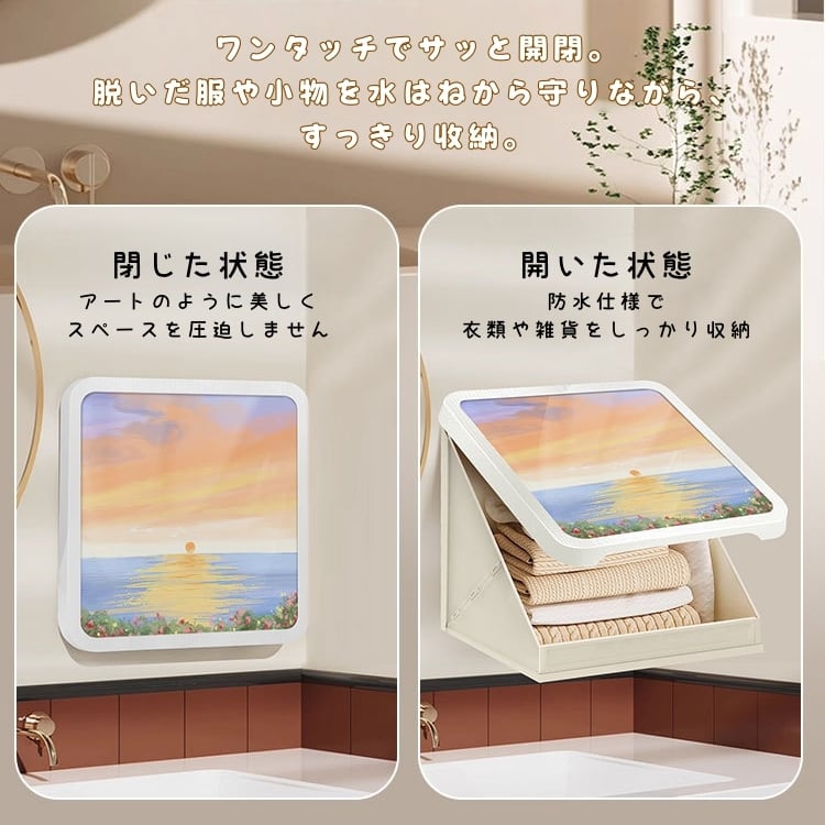 浴室の壁が、おしゃれな壁画から便利な収納ボックスへと早変わり。入浴時の脱衣置き場に困らない、画期的な壁掛け収納アイテムです。折りたたみ式でスペースを取らず、防水・防塵設計で衣類を清潔に保ちます。穴あけ不要の強力両面テープ付きで、賃貸住宅でも気軽に設置できます。