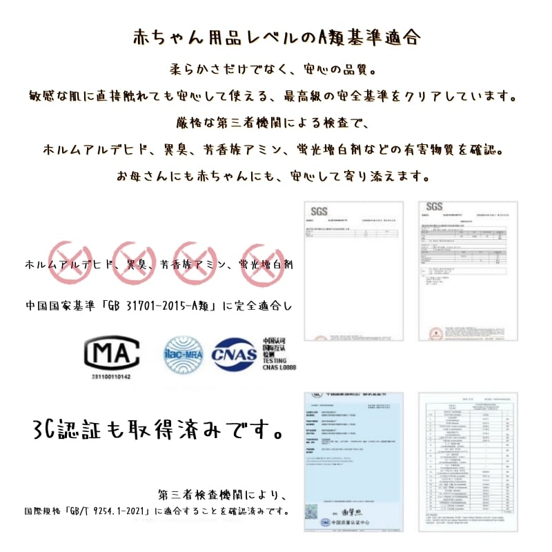 赤ちゃん用品基準である中国国家規格「GB 31701-2015 A類」適合、3C認証取得。第三者検査機関(SGS)により、ホルムアルデヒド・蛍光増白剤などの有害物質不使用を確認。敏感な肌にも安心してお使いいただけます。