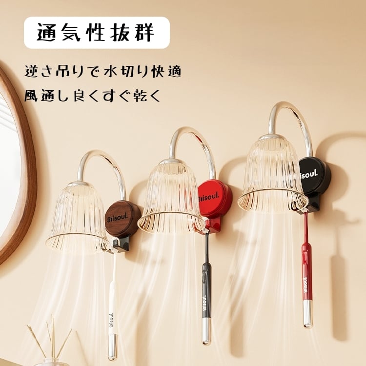 ブラシ部分を上向きに吊るす独自設計。水が溜まりにくく、風通しが良いためカビや雑菌の繁殖を抑制し、清潔な状態を長く保ちます。