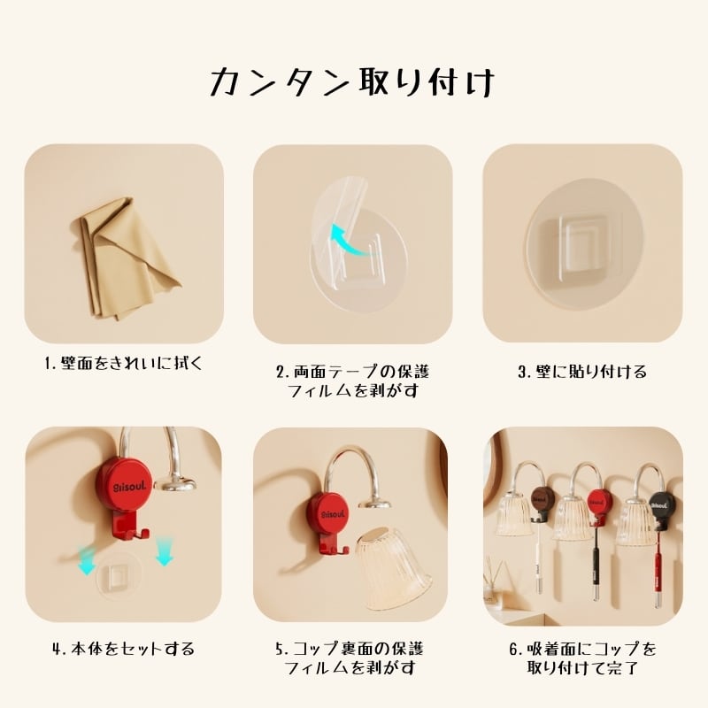 ※取り付け前は、壁面のほこりや水分をよく拭き取ってください。清潔で平らな面への設置が接着強度を保ちます。