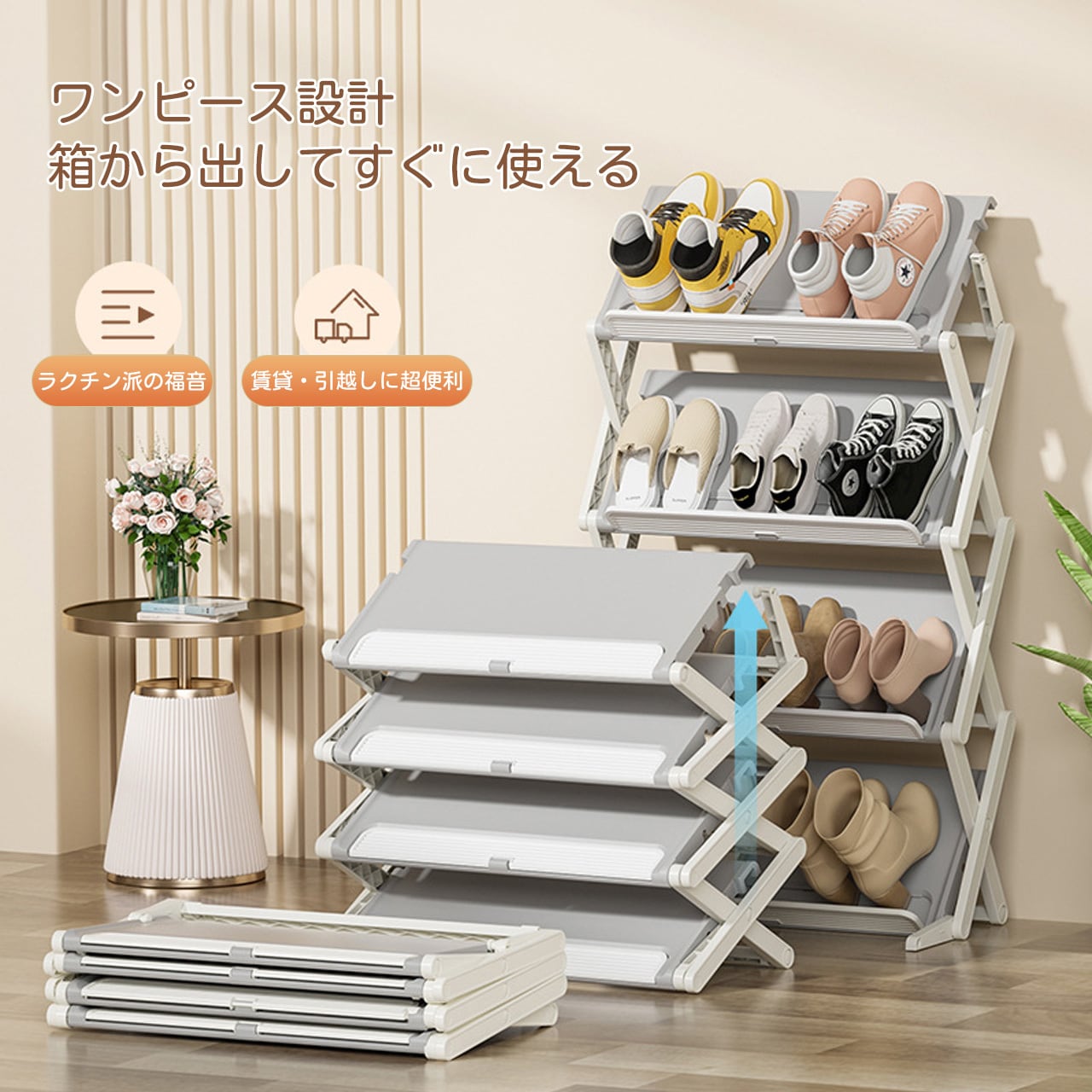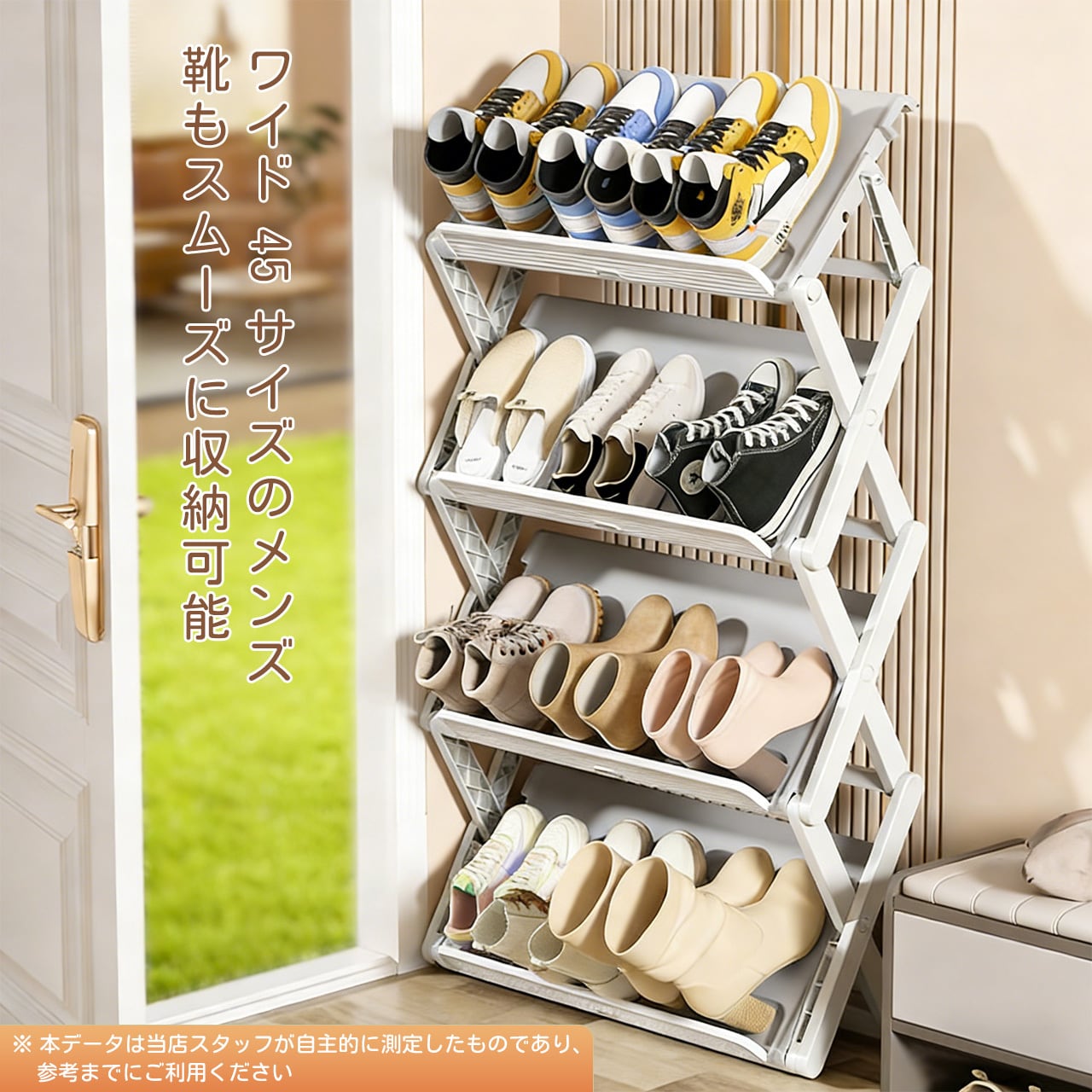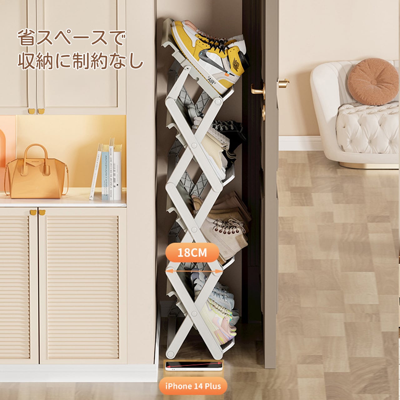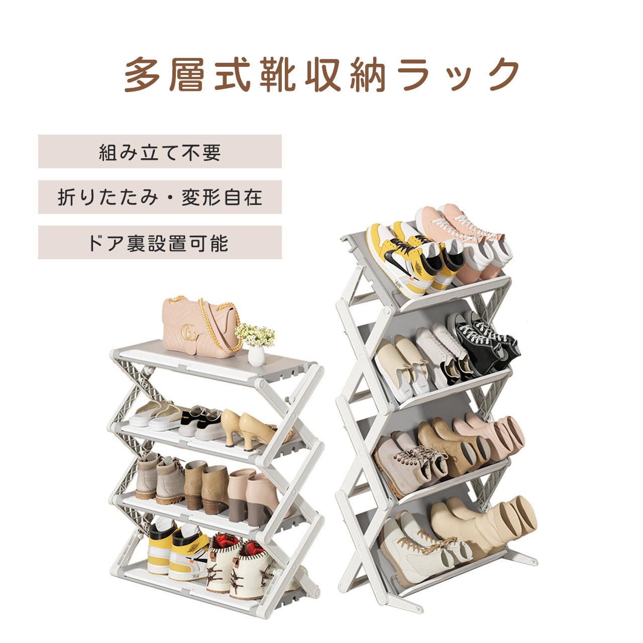 多層収納棚で靴を整然と並べられ、ショートブーツ・スニーカー・ハイヒールなど、様々な靴タイプに対応。不用時は薄く折りたためて、クローゼットの隙間やベッドの下にも収納可能。