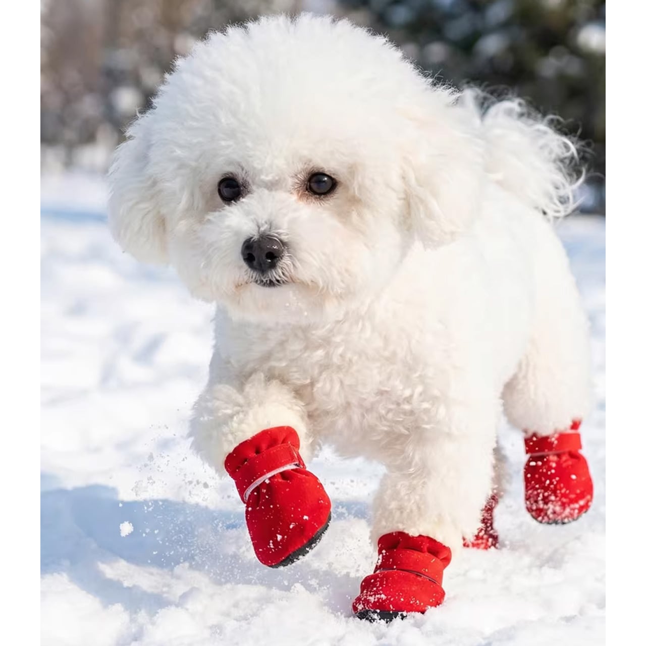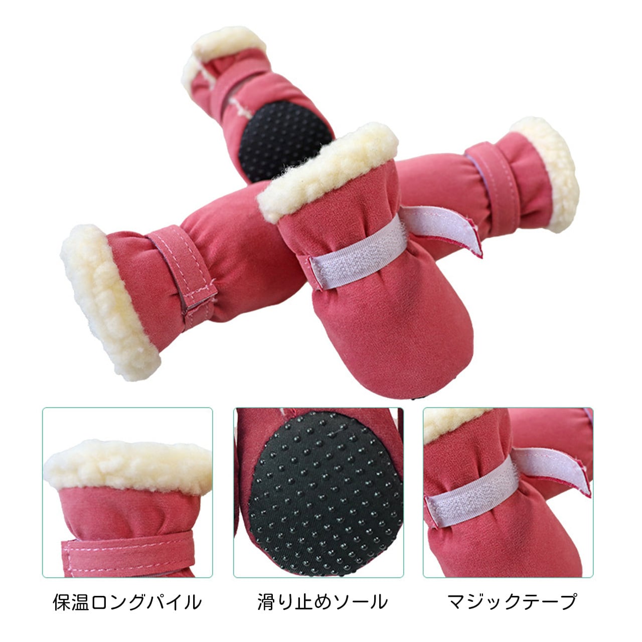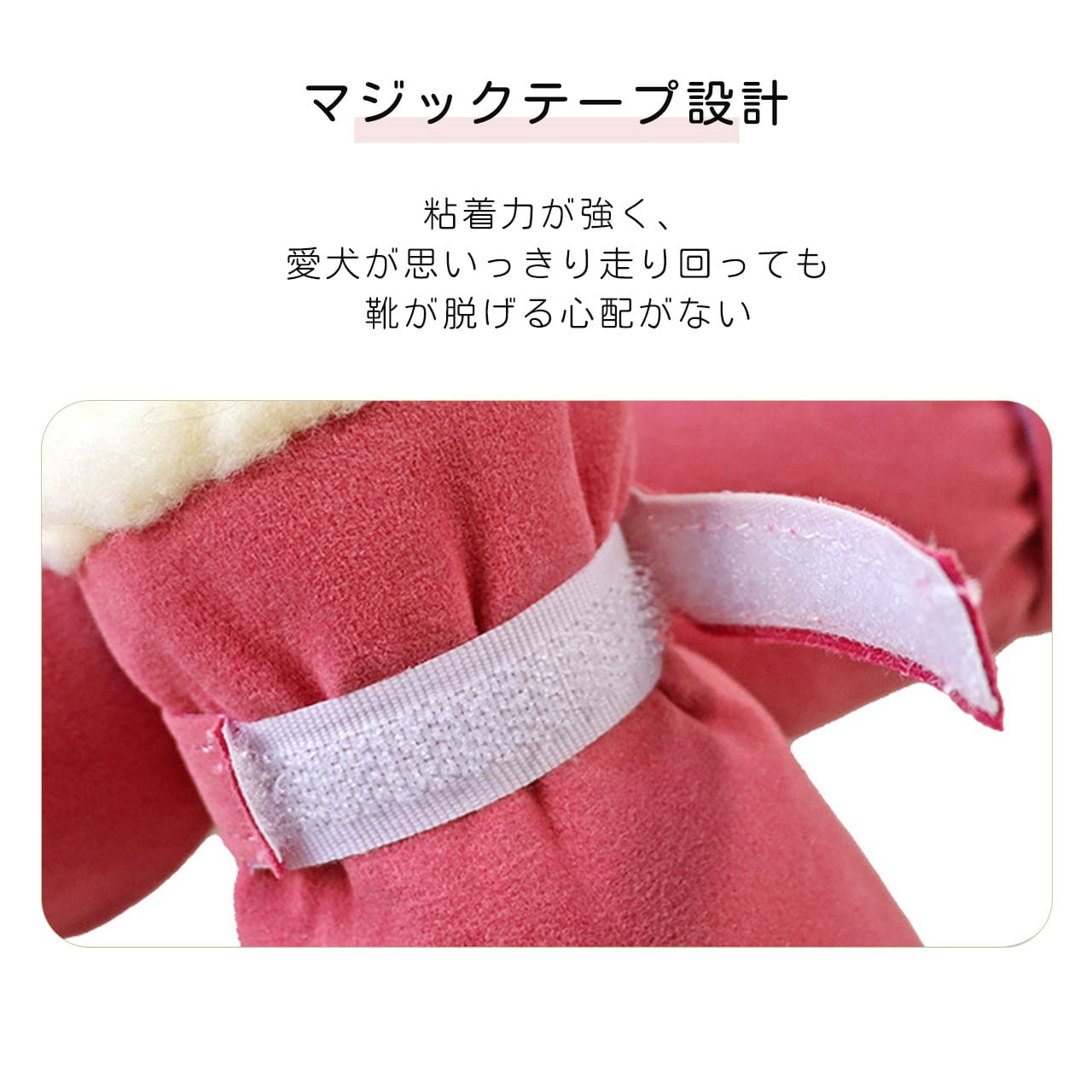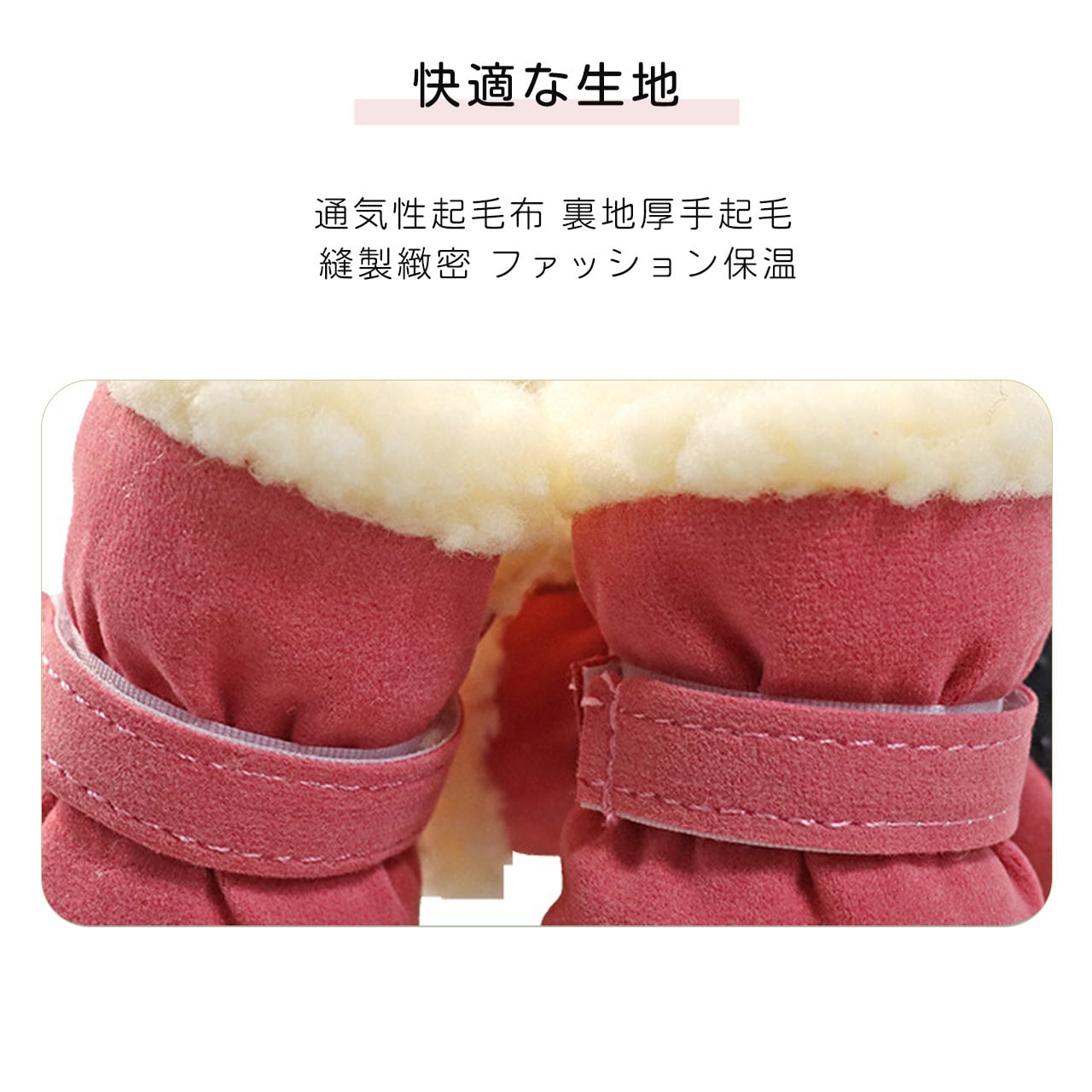 靴の内側には柔らかい裏起毛素材を採用し、愛犬の足元を暖かく包み込みます。寒い雪地や冷たいコンクリート路面でも、肉球の温度を保ち、低温やけどや凍傷を予防します。素材は肌触りが良く、愛犬が嫌がることなく着用できるように設計されています。