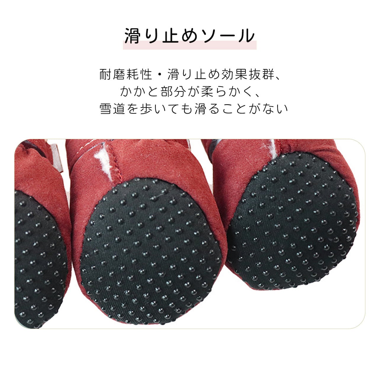 靴底には凹凸の滑り止め加工を施し、雪地や濡れた路面でも滑りにくくなっています。柔らかいソールが地面の凹凸に追従し、愛犬の歩きやすさを損なうことなく、足元の安定性を高めます。また、ソールが肉球を保護し、ガラス片や鋭い小石から足を守る効果もあります。