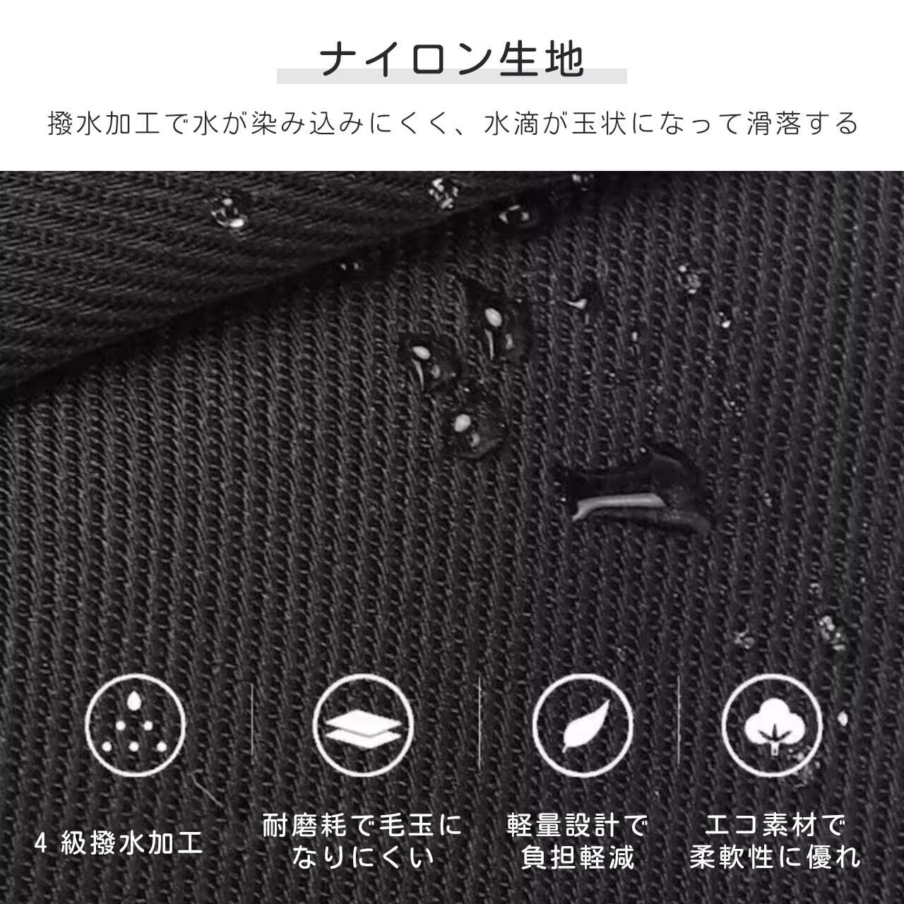 4級撥水加工を施したナイロン生地は、小雨や水滴をはじき、汚れも付きにくい。軽量で丈夫、毛玉になりにくい特性で、毎日の使用やアウトドアにも安心です。