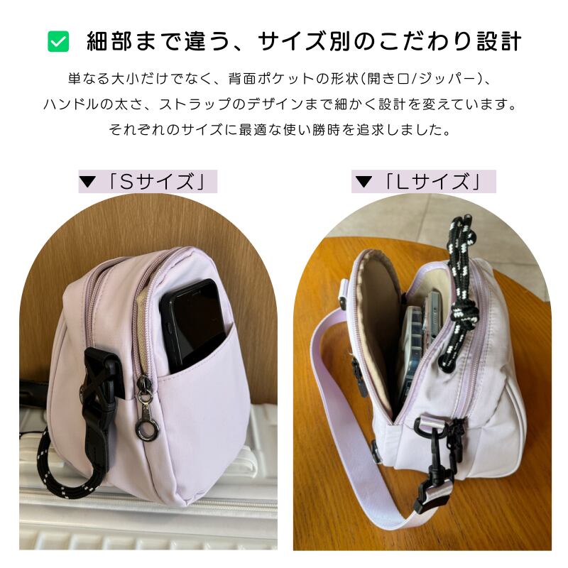 単なる大小だけでなく、背面ポケットの形状(開き口/ジッパー)、ハンドルの太さ、ストラップのデザインまで細かく設計を変えています。それぞれのサイズに最適な使い勝時を追求しました。