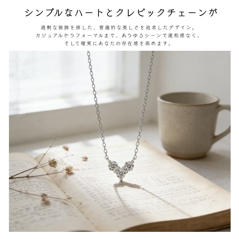 ✅ シンプルなハートとクレピックチェーンが「どんなスタイルも上品にまとめる」